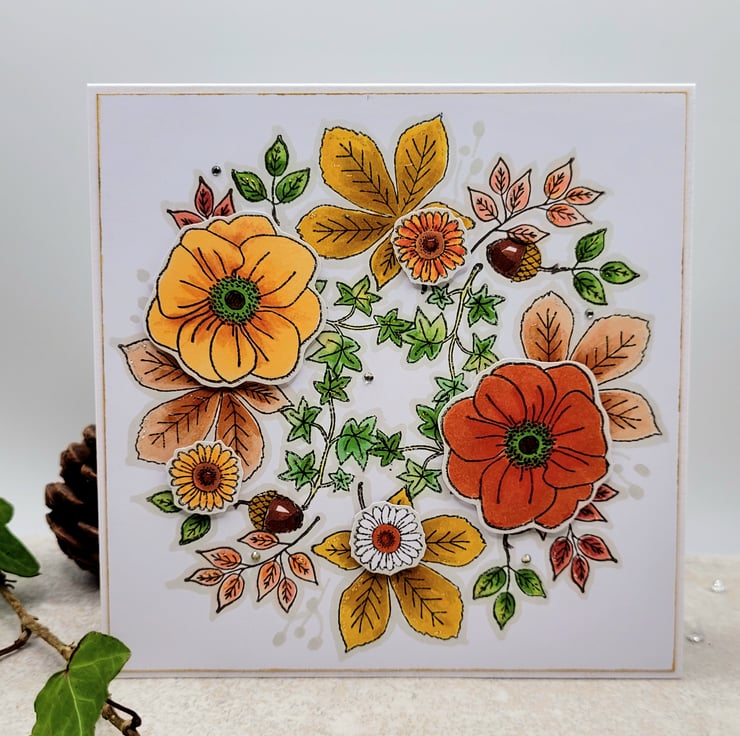 A blank 12.5 cm x 12.5 cm greetings card stamped by hand with blooms, ivy and foliage. An individually designed, handmade card that's great for any occasion. The inside is blank for writing a message. The card will be supplied with a 100% recycled brown kraft paper envelope. This is a warm and understated design, with lovely gold, brown, orange and fresh green tones.