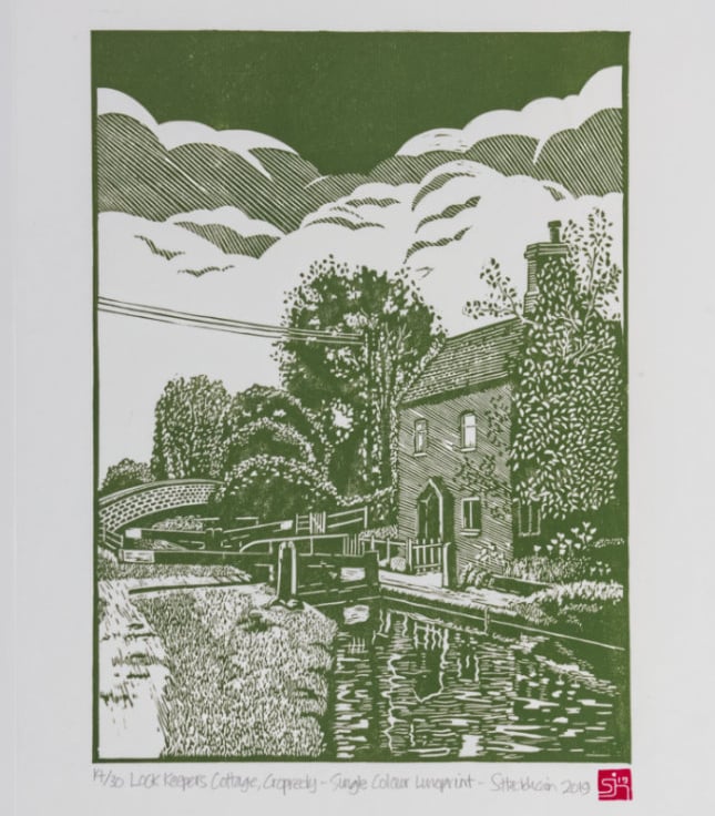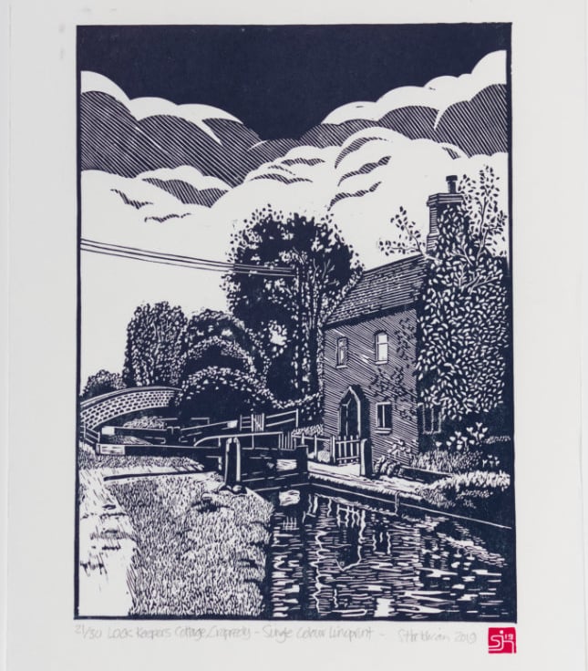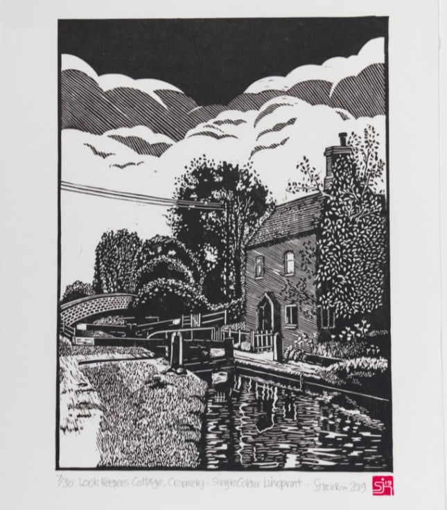 Single Colour linoprint of this Lock Keepers Cottage on the Oxford Canal. This is one of a series of canal prints I have planned. It is a limited edition of 30. Hand printed on Awagami Hosho printmaking paper with Cranfield safe wash inks in Black, Blue or Green.