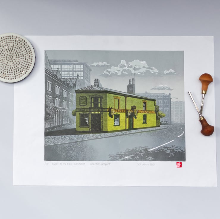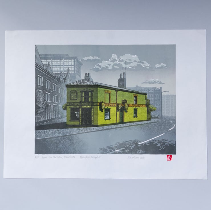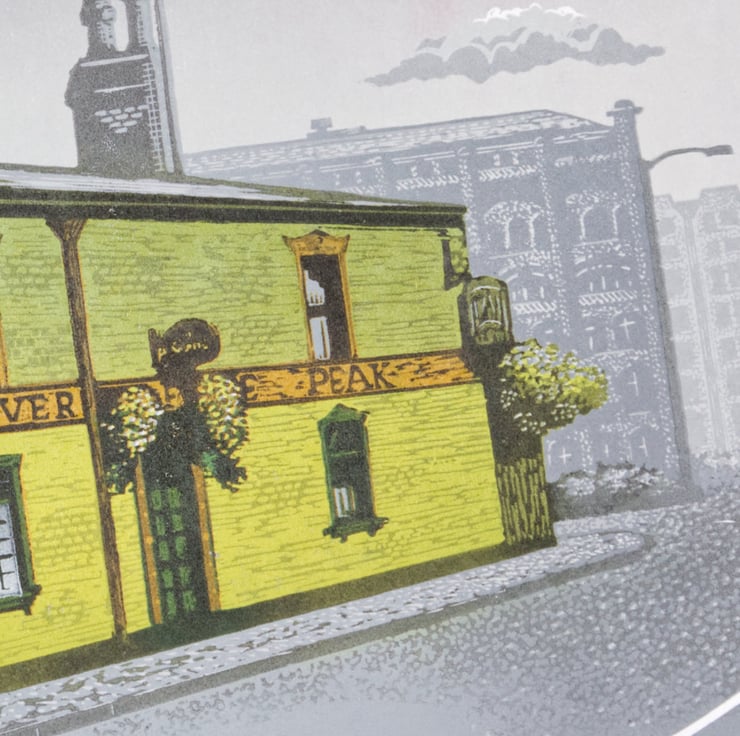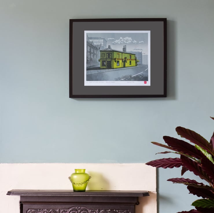Hand printed on Awagami Masa printmaking paper, this is a limited edition of 20. It is a reduction linoprint. Standing alone in a triangular plot the grade 11 listed Peveril was once part of a terrace, but is now the only standing survivor. It is now the only detached pub in Manchester and is rumoured to have a resident ghost. It’s a good old-fashioned pub.