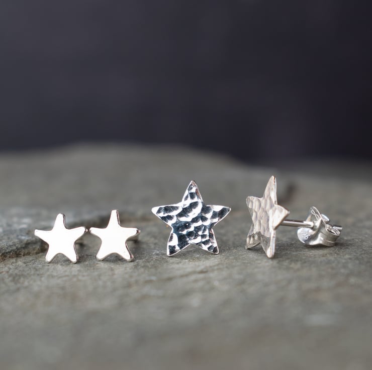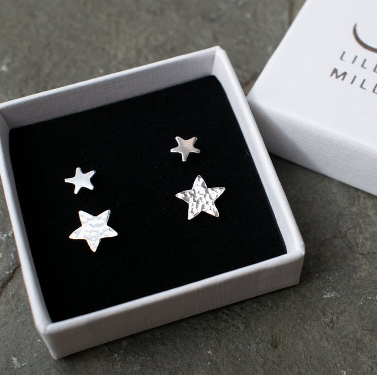 These star earrings are crafted in 925 sterling silver and look lovely layered together if you have multiple piercings. The larger 10mm pair have been delicately hammered to give the textured finish which dazzles in the light. The tiny 5mm pair are left plain to give a lovely contrast of textures.