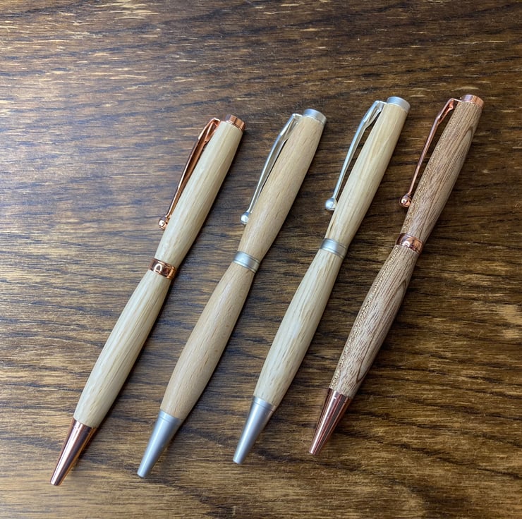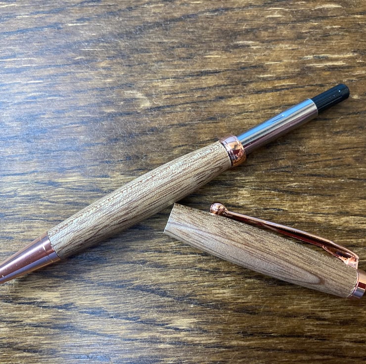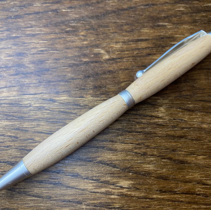 This pen has been made from reclaimed Beech which was originally from a broken dining chair. The pen has been made with a slimline kit which has a satin silver finish. The wooden component was hand turned on our lathe and has three coats of melamine lacquer and a final coat of microcrystalline wax for durability.