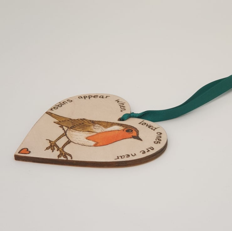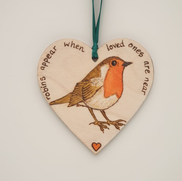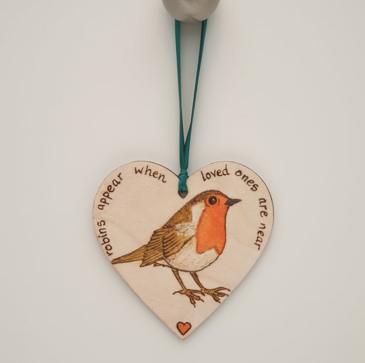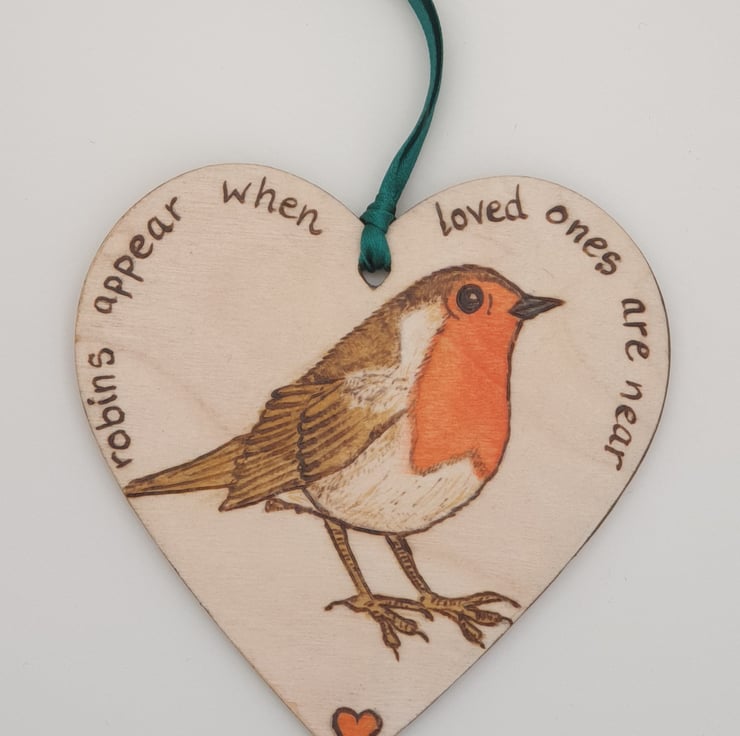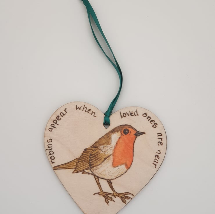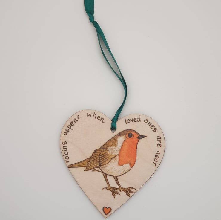 Handburnt wooden heart decoration featuring a beautiful robin and the words "robins appear when loved ones are near". This lovely heart has been decorated using the art of pyrography, coloured using acrylics and finished with several coats of satin varnish. The heart comes ready to hang with green satin ribbon and would look great hanging in a window, on a Christmas tree or from a handle.