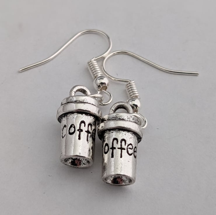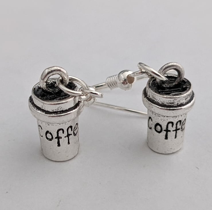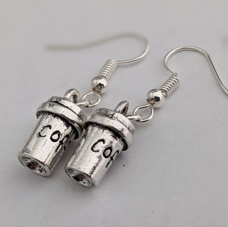15mm 3D Tibetan silver takeaway coffee cup earrings, on hypo allergenic silver plated hooks.
