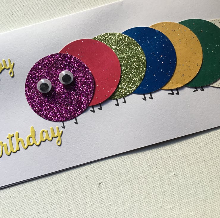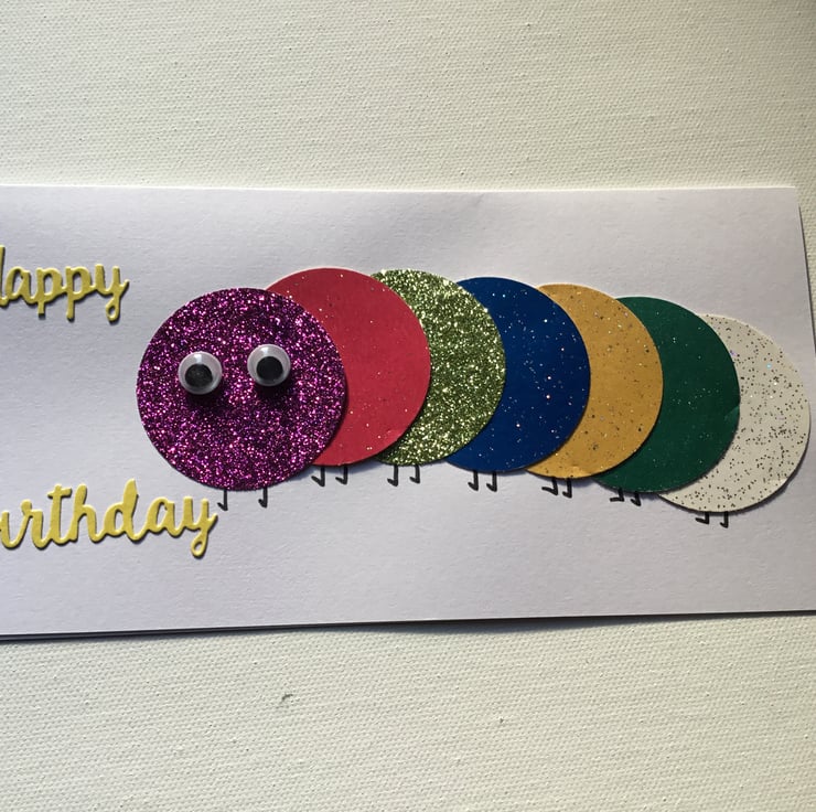 A cute, multi coloured caterpillar Birthday card with googley eyes.