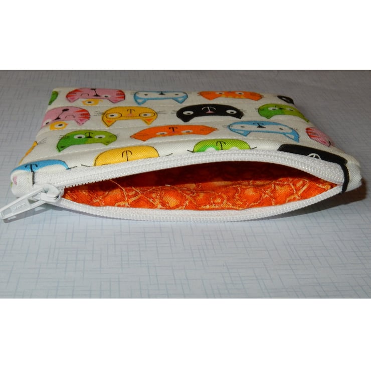This cute zip pouch would be great as a purse or to carry every day small essentials. It measures approx. 5 x 4 inches (12 x10 cm). It is made from fabric featuring colourful cat faces. It has been quilted to enhance the effect. It is lined in orange print fabric, and is fastened with a zip.