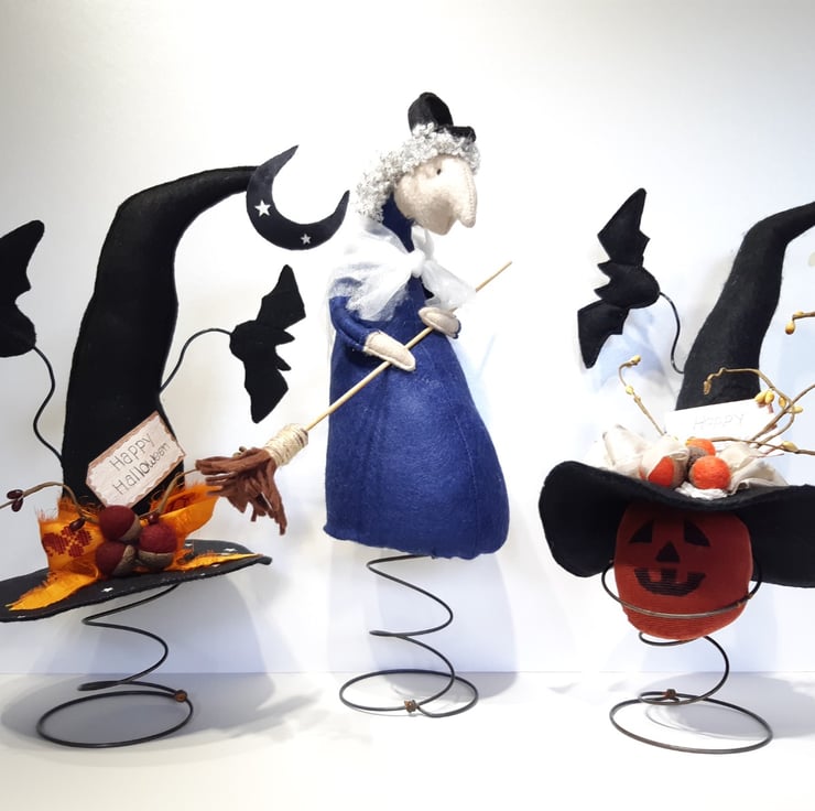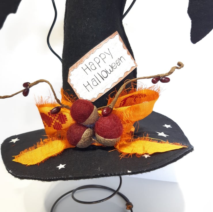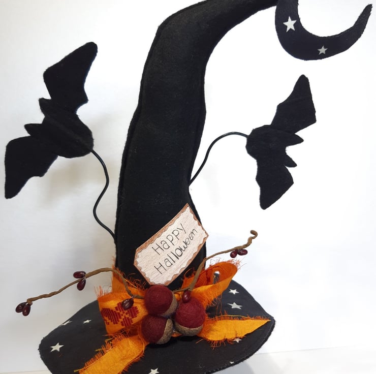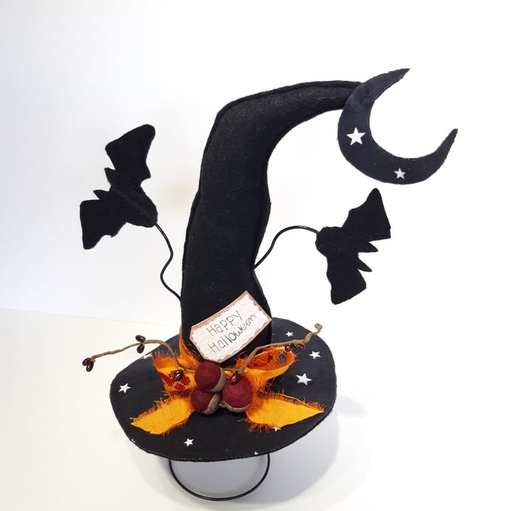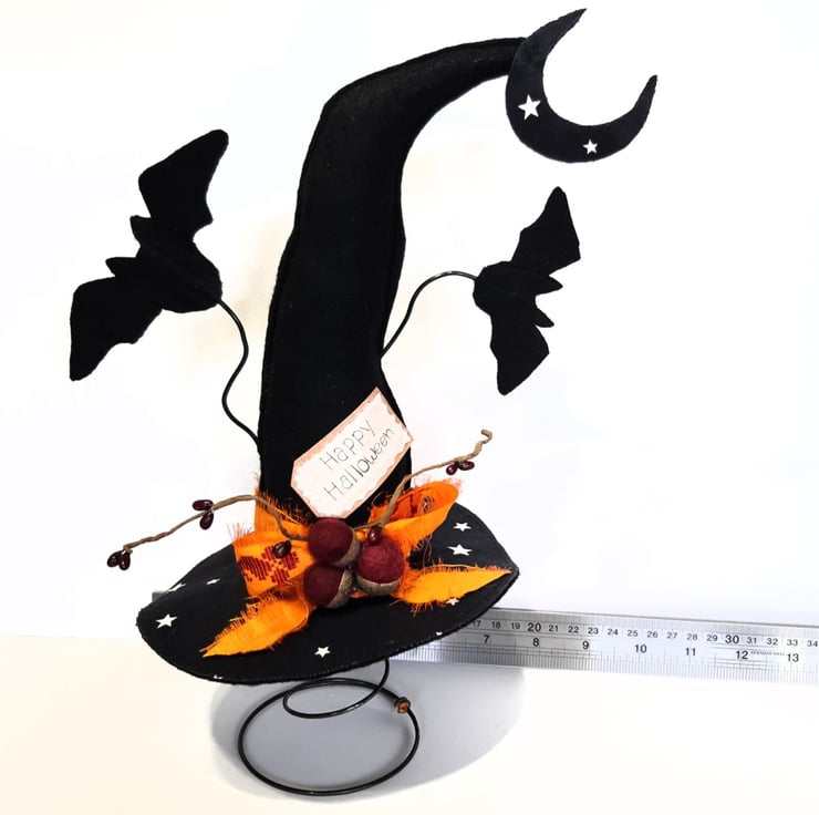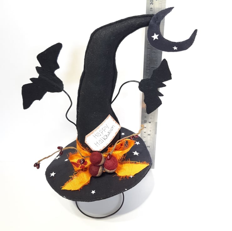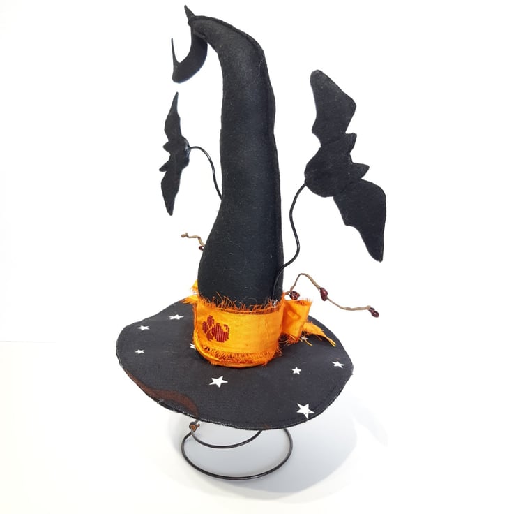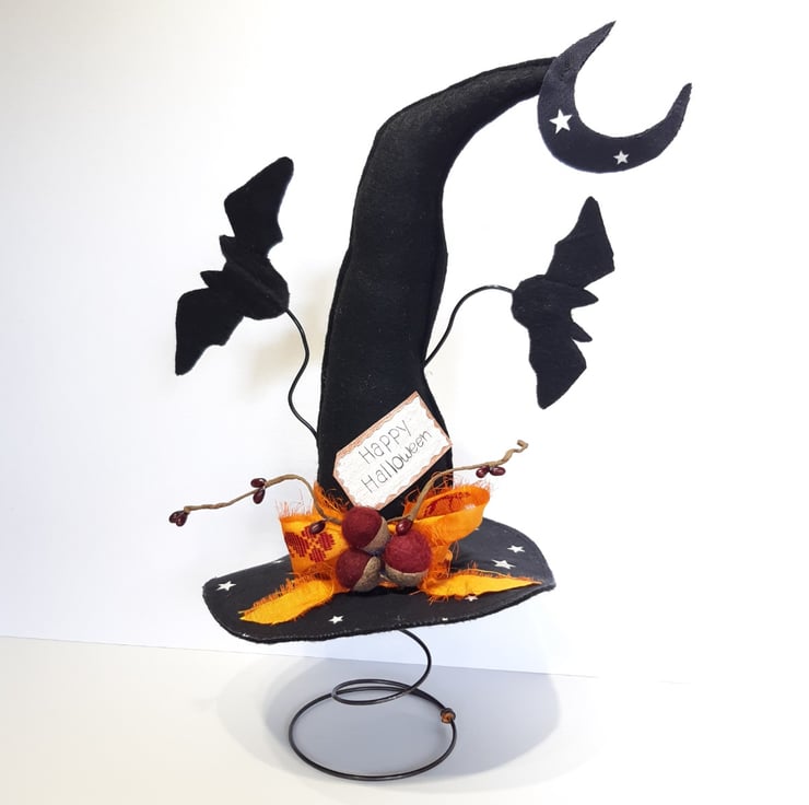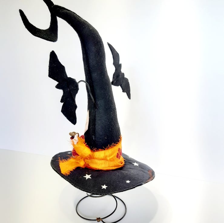 This fun witches hat is made using black felt for both the hat & bats, I've added in some glow in the dark star fabric to the top of the hat for some extra fun. The bats are secured to crafters wire, which will bend if it's done very carefully. The burgundy acorns are felted wool and they are attached to genuine acorn hats. The vibrant bow is made from recycled sari silk, with the moon also having some glow in the dark stars. All sitting atop of one of my vintage bed springs which makes it really easy for it to be put on display in the perfect spot. Would make a gorgeous fun table centre piece.