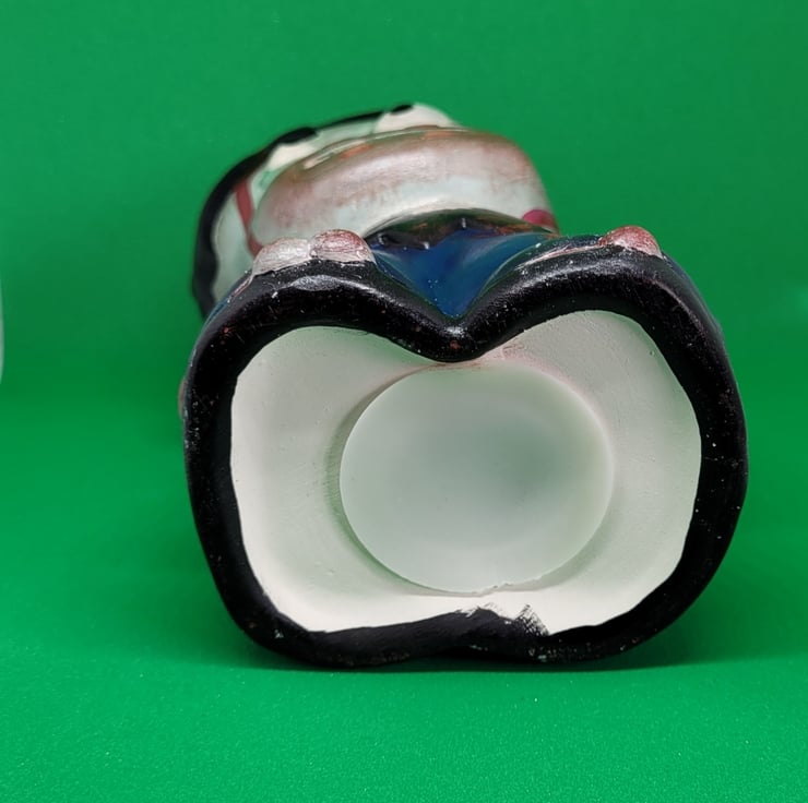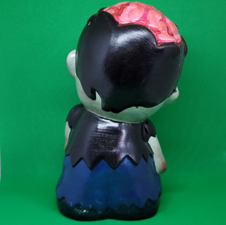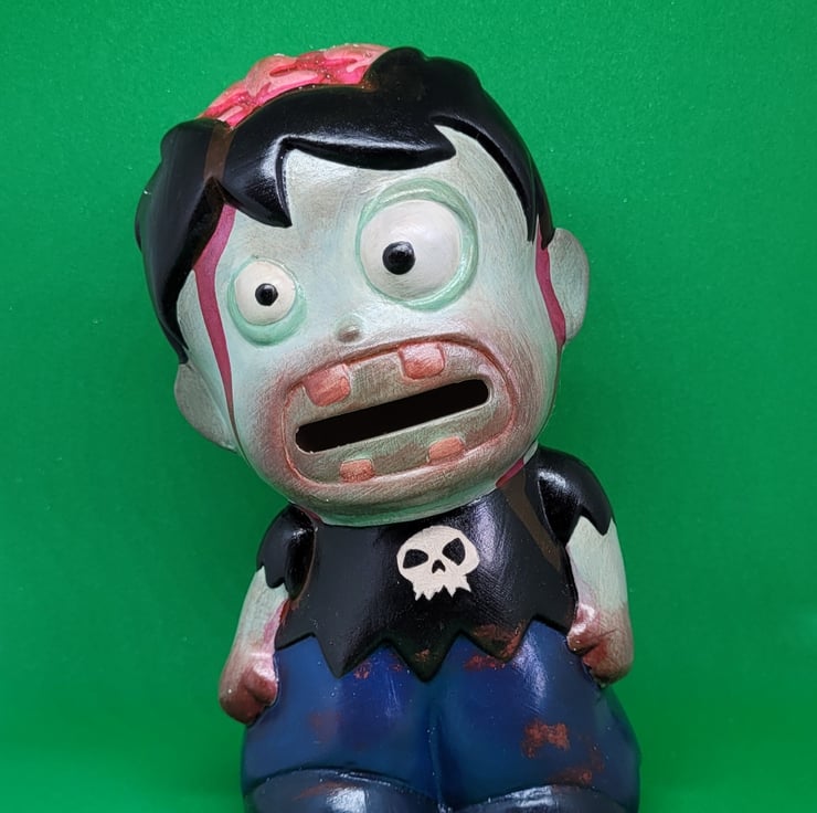 This zombie moneybox was inspired by Sid from Toy Story. Hand painted money box stands at 6" high. Coin slot at the back of the head can take all coins. Plastic stopper underneath.