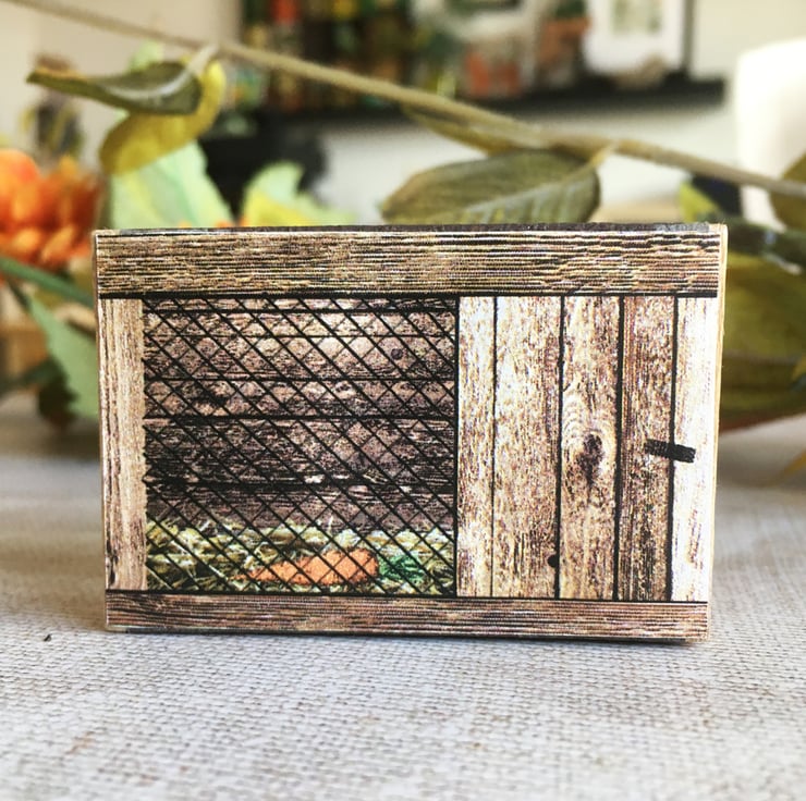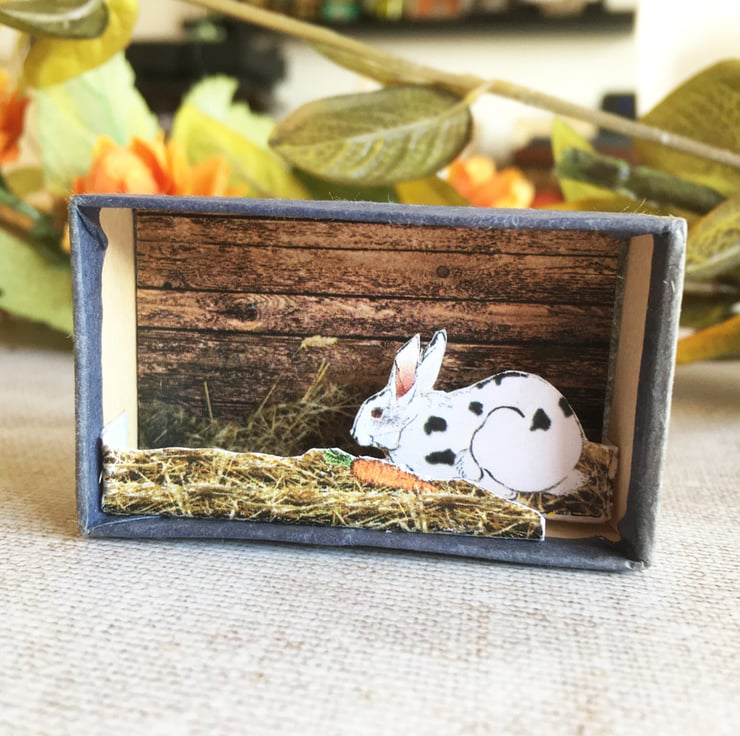This tiny diorama of a rabbit in a hutch is housed inside a vintage matchbox. I've covered the top label and made the scene inside using colour paper copies backed with card.