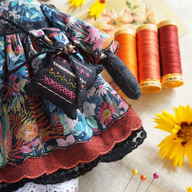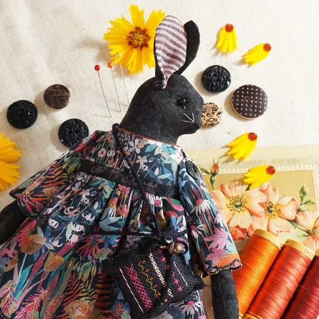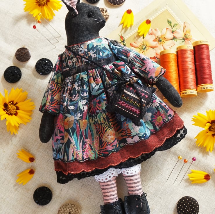 Frida is a tiny bunny lady dressed in a lovely Liberty Lawn, a fabric called Faria Flowers. Rich tropical garden on a black ground. She has rose petals in her stuffing with a carnelian crystal to her heart, hand embroidered features and a little black pompom tail. She is finished with tiny buttons, organza ribbon and little leather shoes.