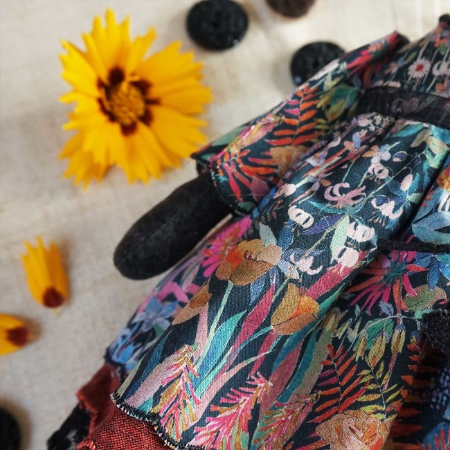 Faria Flowers is an old print revisited by Liberty, this is the rich tropical version. A lush flower garden in pinks, oranges and blues teamed here with a russet shot cotton and black tulle lace. The linen that is her legs is carried throught to her ears and is hand dyed to coordinate.