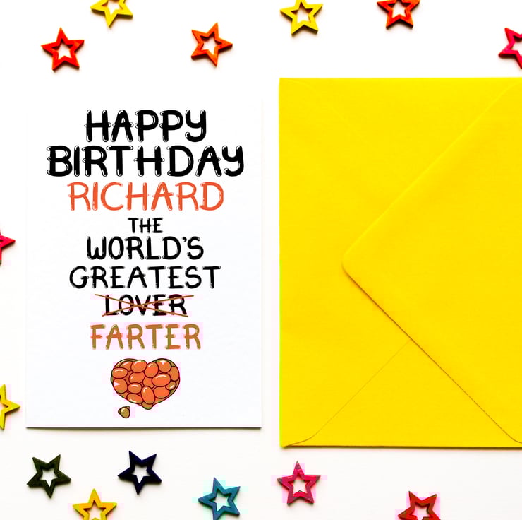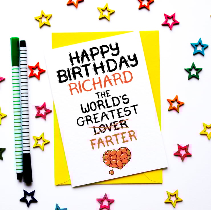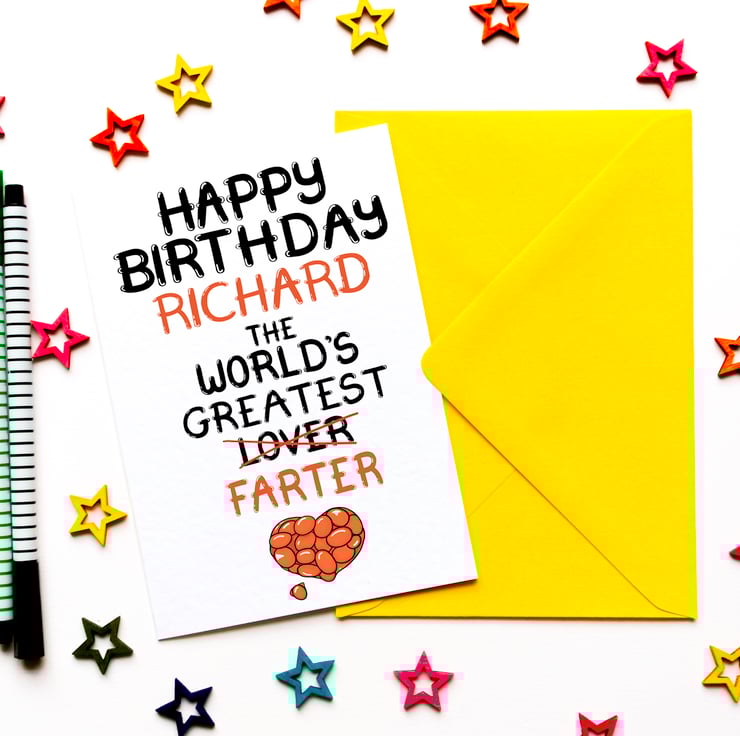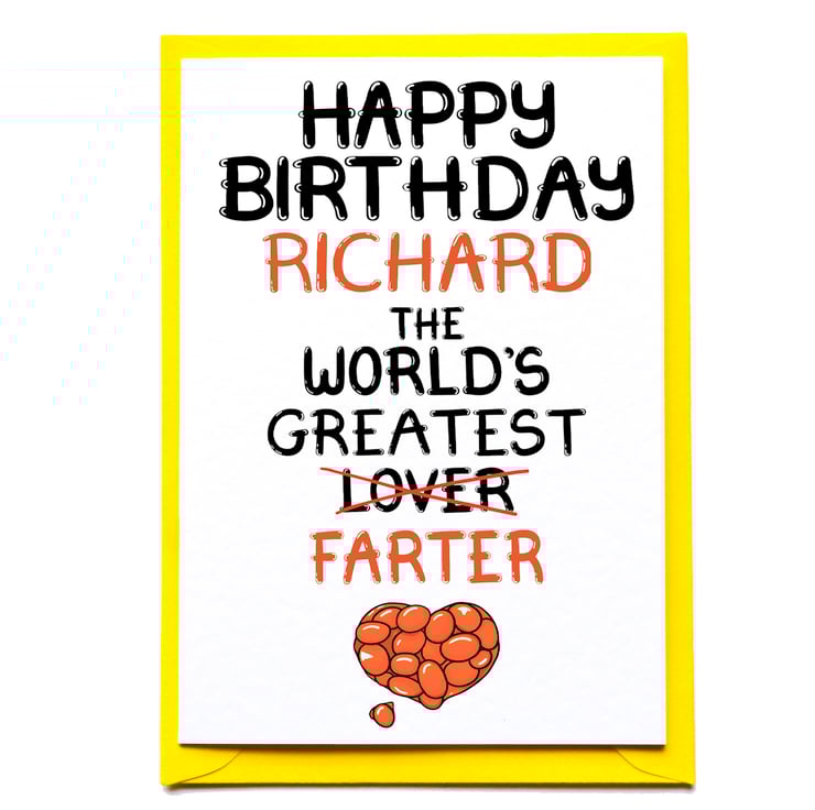 Greeting on front: HAPPY BIRTHDAY (NAME) TO THE WORLD'S GREATEST (LOVER) FARTER
