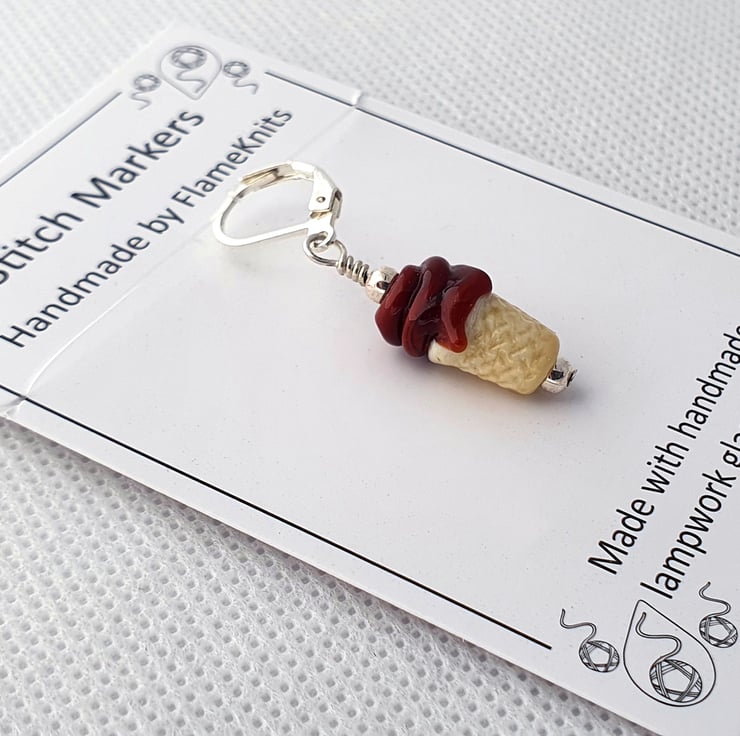A tiny handmade glass ice cream stitch marker with a textured "waffle cone" and rich brown chocolate toppings.