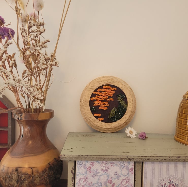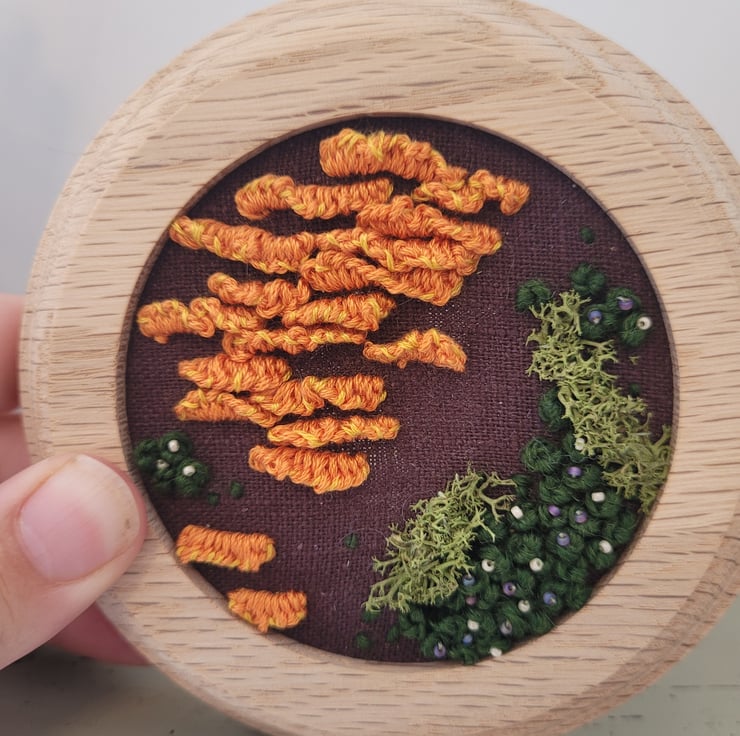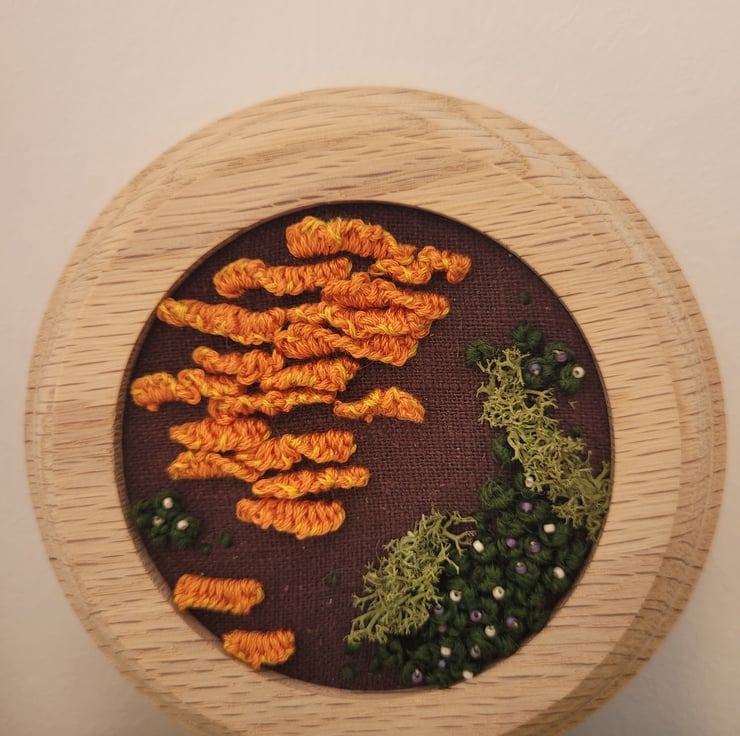 Hand embroidered fungi and moss on linen.