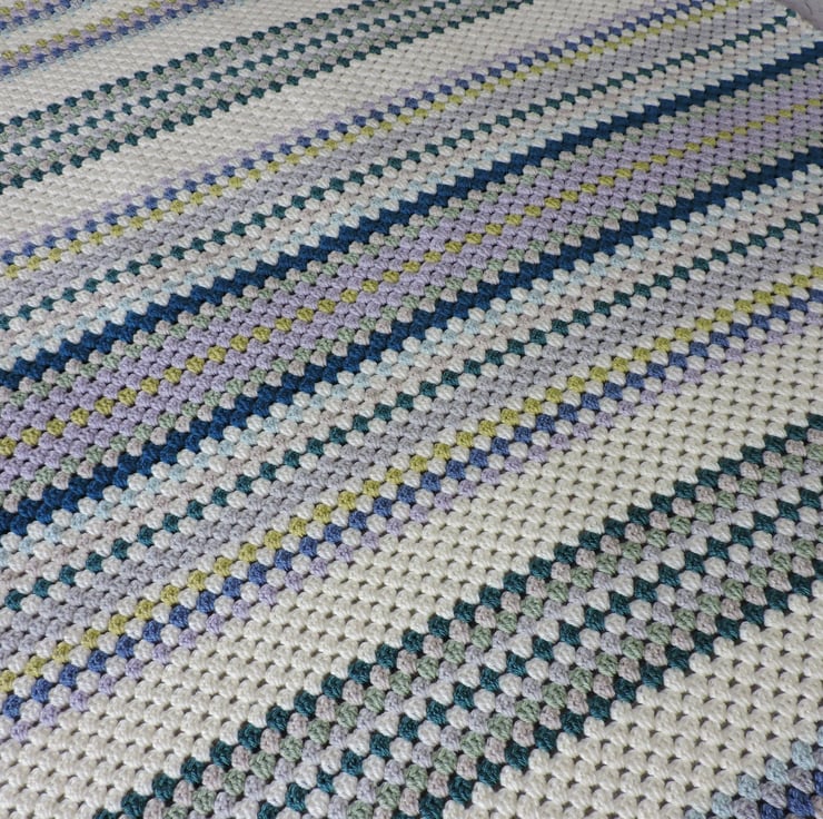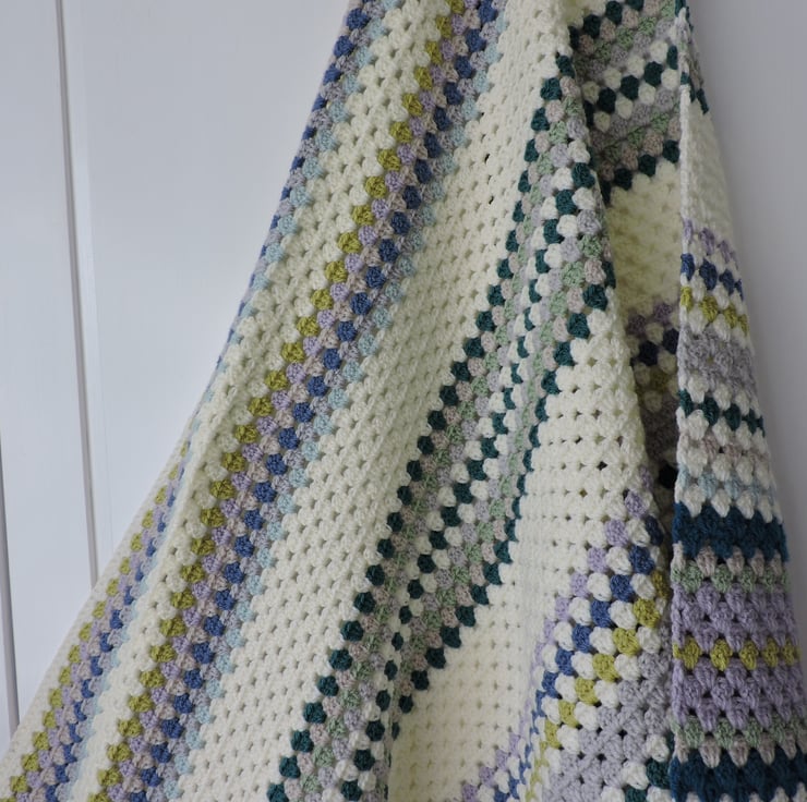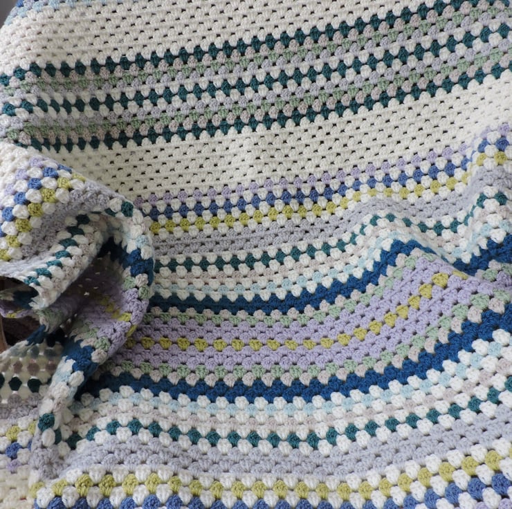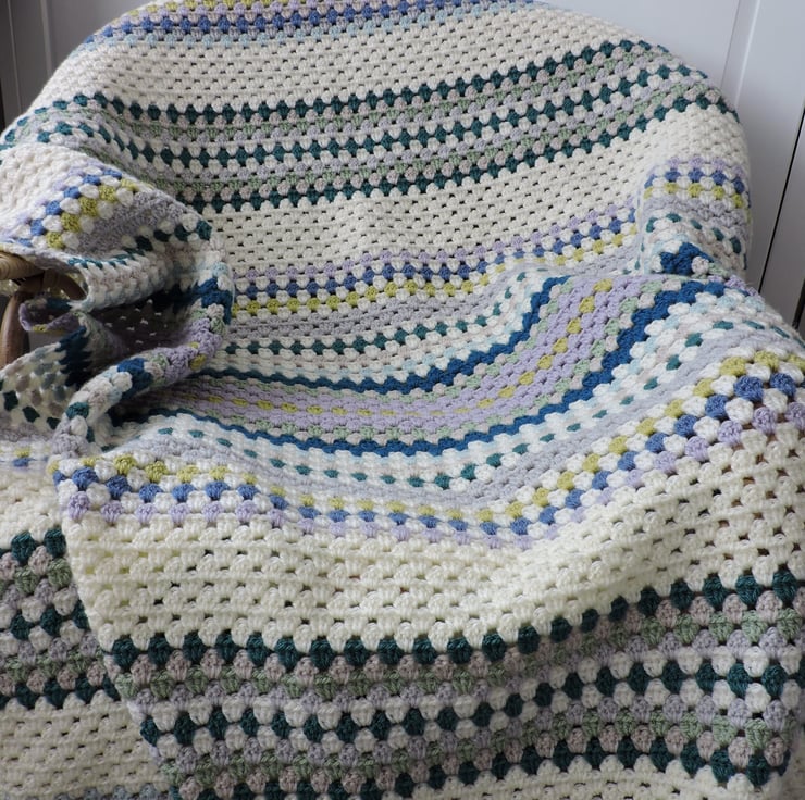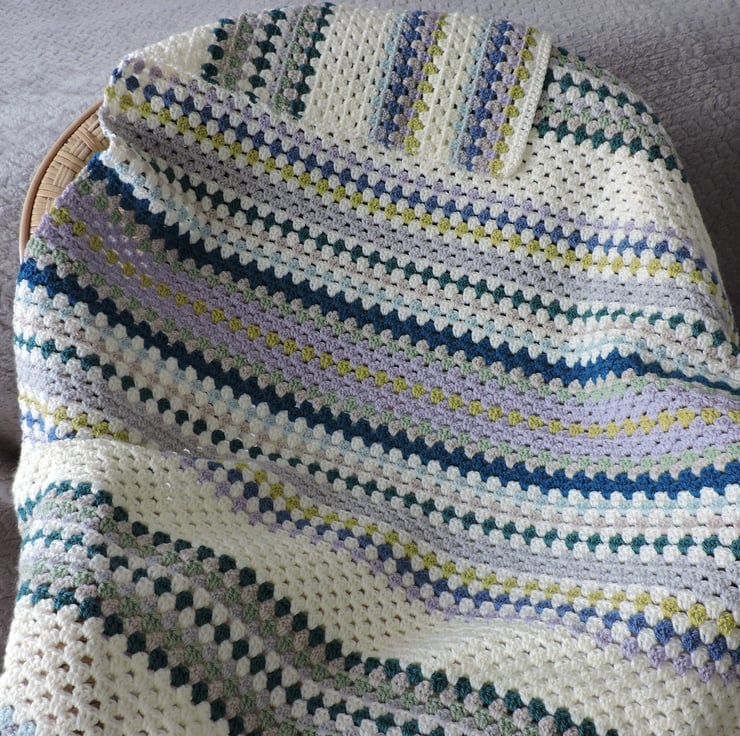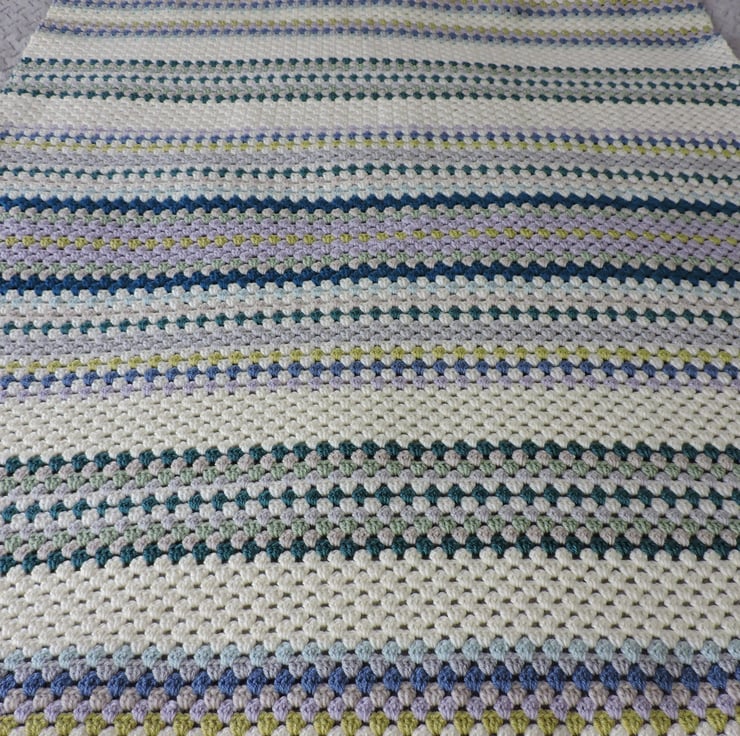 Sale A crochet blanket which I've made with 100% premium acrylic double knit yarns. Random size stripes in an assortment of blue, teal, green, lilac, cream, taupe and lime yarns have been used for this cosy blanket. Ideal as a lap blanket, picnic blanket, wheelchair blanket,