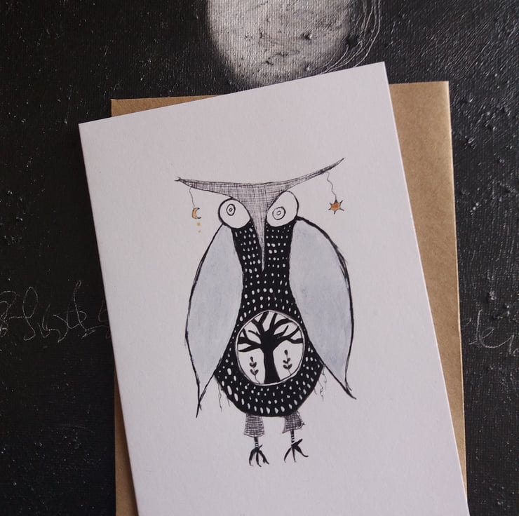 a little inky owl printed on a sturdy 300gsm weight, nice smooth matt white card, made from recycled consumer waste.