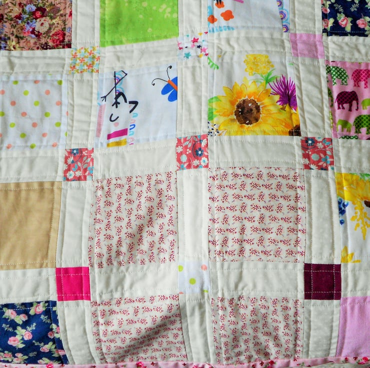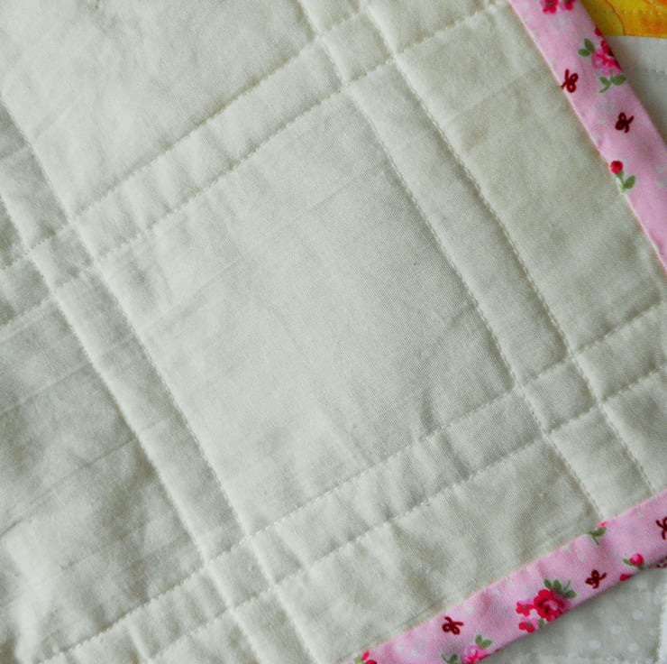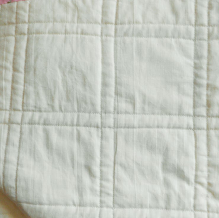 All the fabrics are cotton and so is the inner wadding, giving a light but warm quilt. The backing fabric is a cream plain cotton and the floral binding is machine sewn to the front but carefully hand sewn to the back. The quilting is a shadow pattern giving a geometric pattern on the back of the quilt.