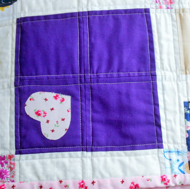 A patchwork quilt in a variety of floral and plain fabrics which include some Moda Fabrics. The various fabrics have been arranged in a pleasing quilt pattern with heart applique in two corners of the quilt.