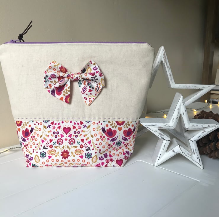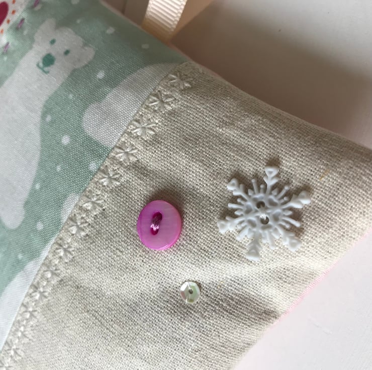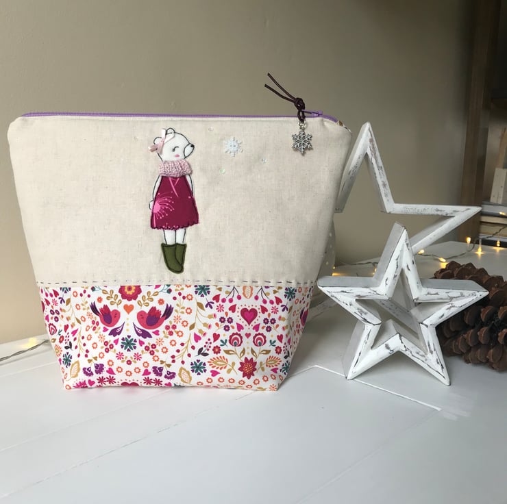 You will receive one 11.5” wide by 9.5” tall with a 5” box bottom bag. The bag has a free motion embroidered Hollie the polar bag on the front and a beautiful big bow on the back. It is a fully lined zippy project bag and has a lobster clasp inside to hang your bits and bobs on.