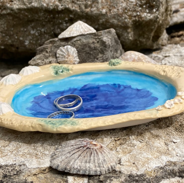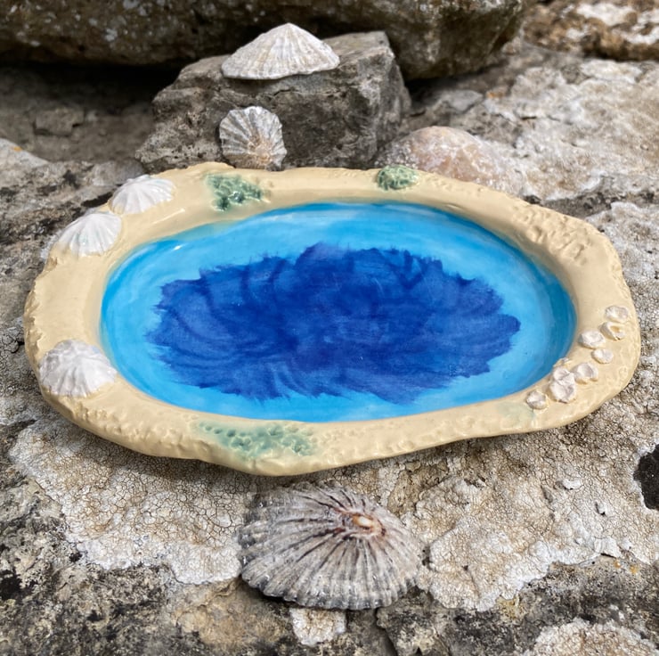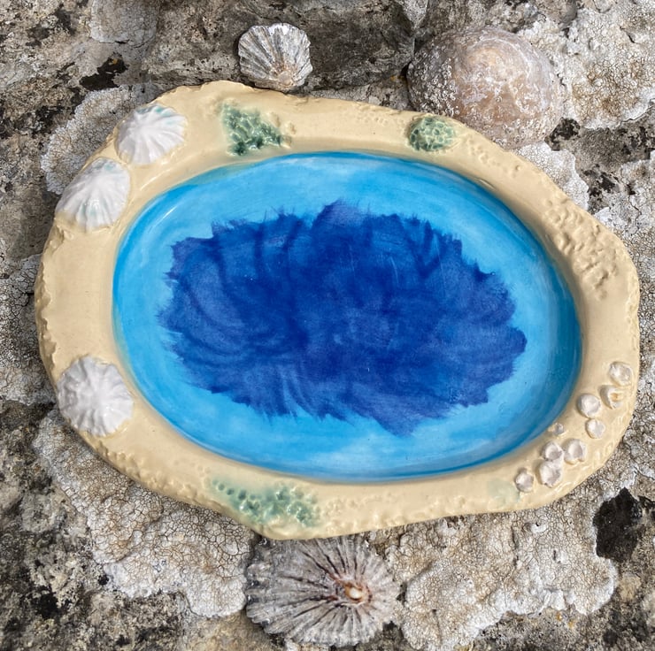 Handmade asymmetric ceramic dish with limpet shell and barnacle relief design and sky blue earthenware glaze with a touch of cornflower blue. A lovely memory of the beach, suitable as a desk tidy/ trinket or soap dish. Made from my own original design press moulds with textured detail for unique finish.