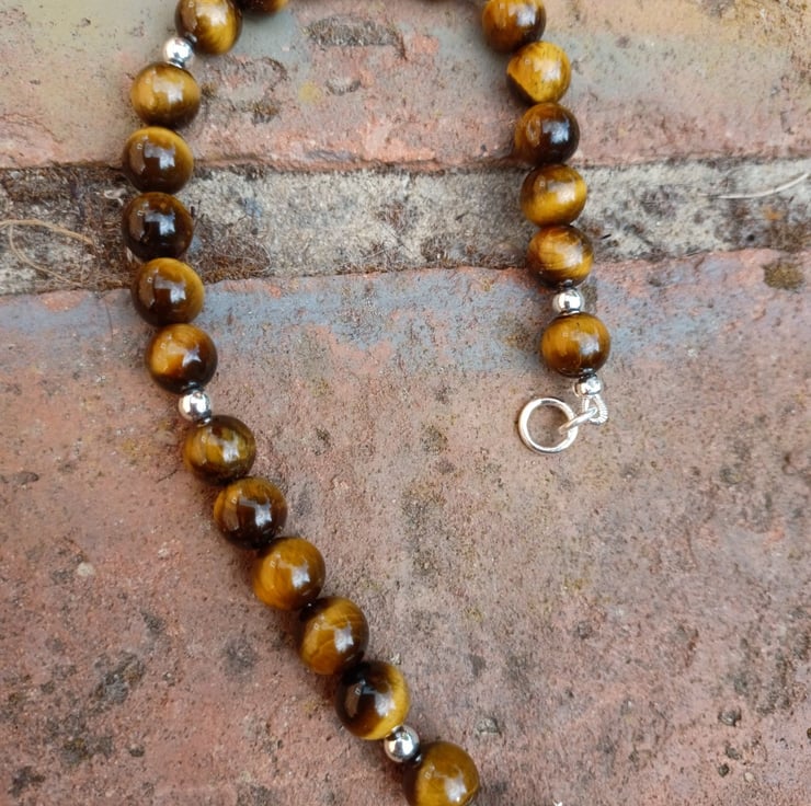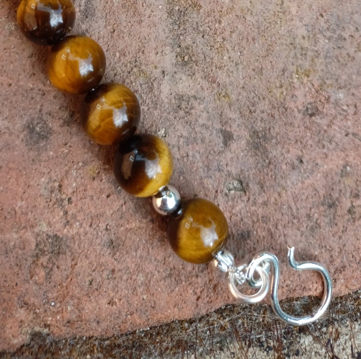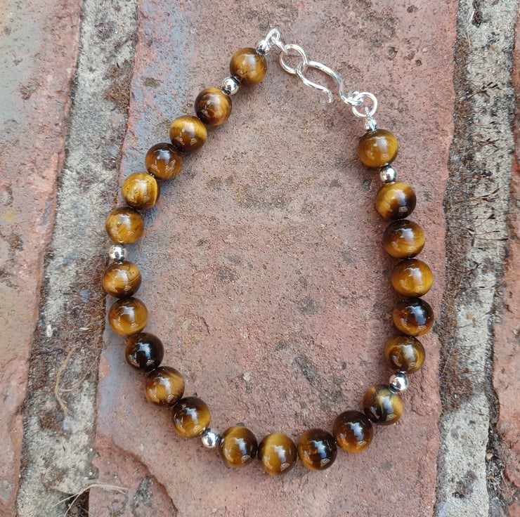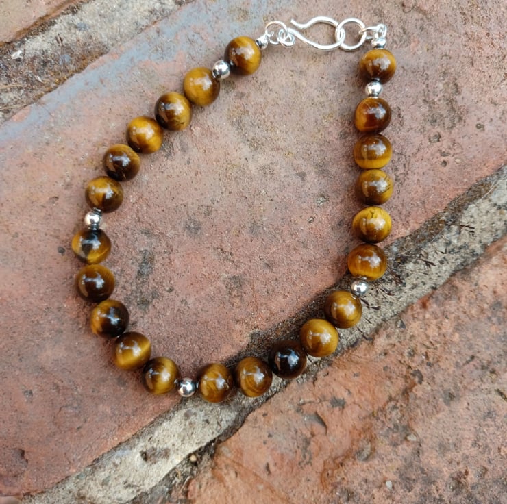 A smart bracelet of Tigers eye and sterling silver beads with a handmade sterling silver clasp. The 22 Tigers eye beads are 8,2mm in diameter interspersed with 5 x 4mm diameter sterling silver beads. Overall, the bracelet is 23cm (9") long.
