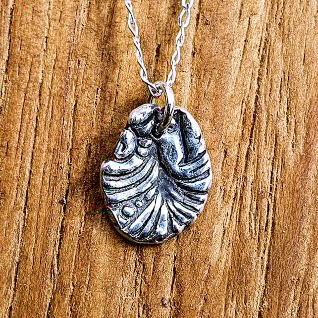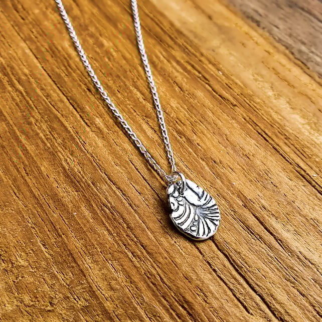 A cute nautilus-inspired freeform pendant handmade from recycled fine silver. The silver is shaped and moulded in a clay form, before being fired to create a solid silver pendant and finished with an 18 inch diamond cut curb chain in sterling silver. Each freeform pendant is individually handmade and so no two are alike.