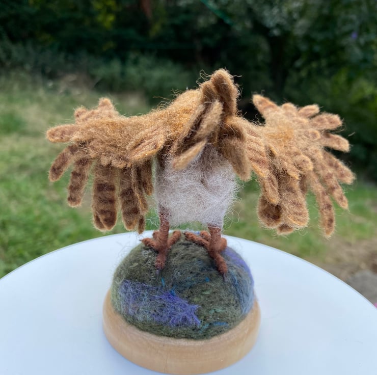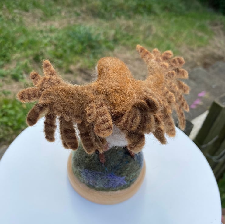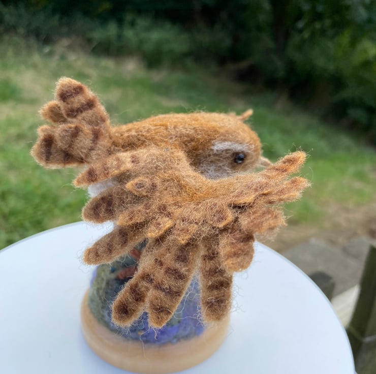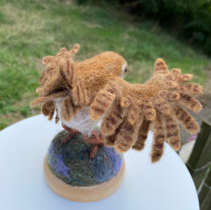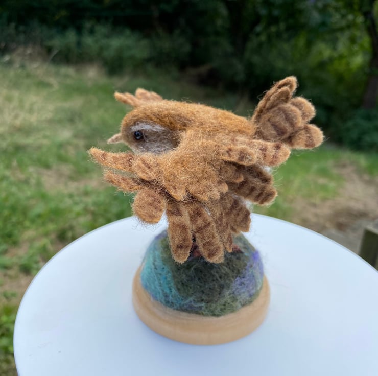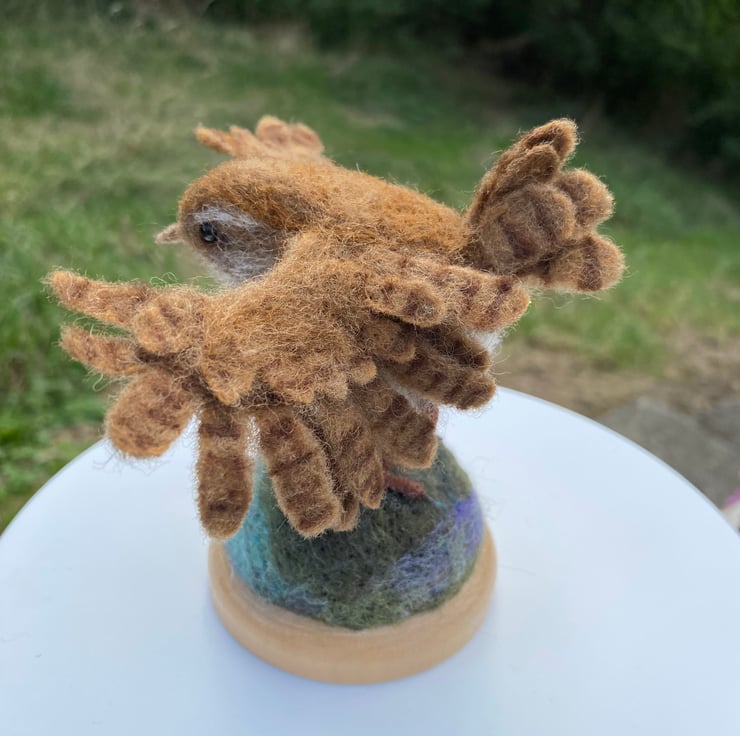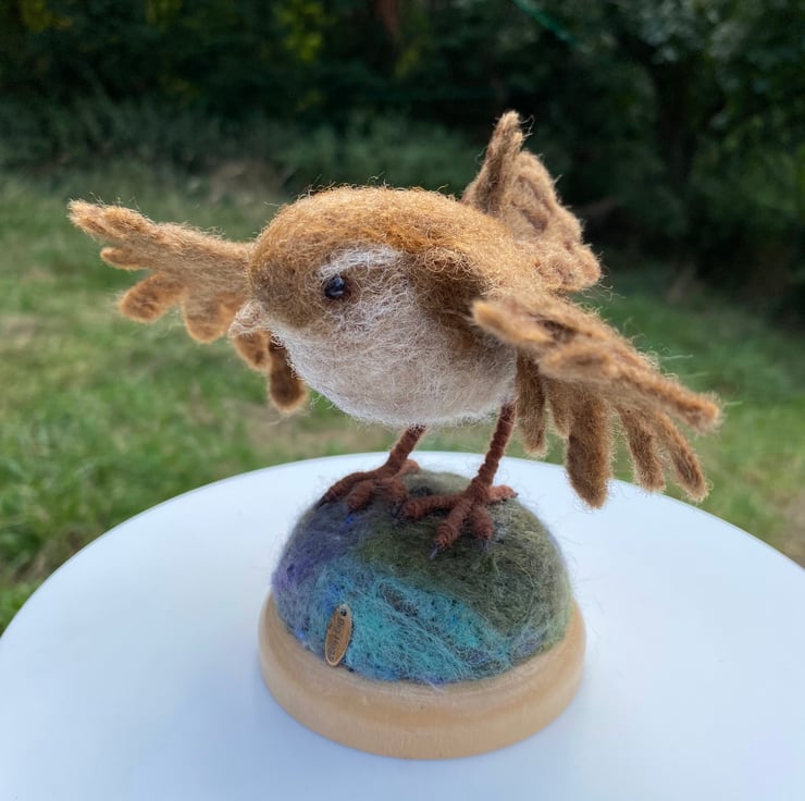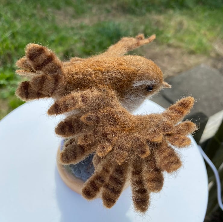 This listing is for a wren with open wings created using the needle felting method. It is made of natural wool fibres and has wire armature in its feet and wings and glass eyes. The wings can be gently posed, but do take care as doing it too much could snap the support wire inside.