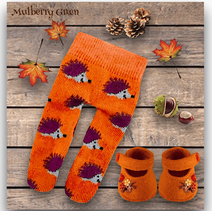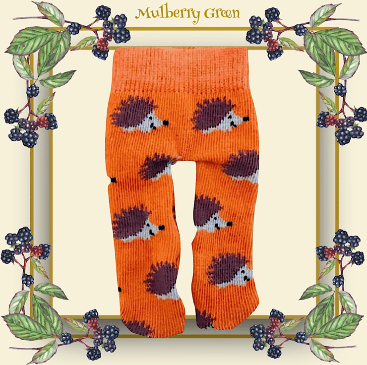 A cute little pair of orange tights in a cute little hedgehog print to fit the Mulberry Green characters. The tights look lovely with the little felt shoes.