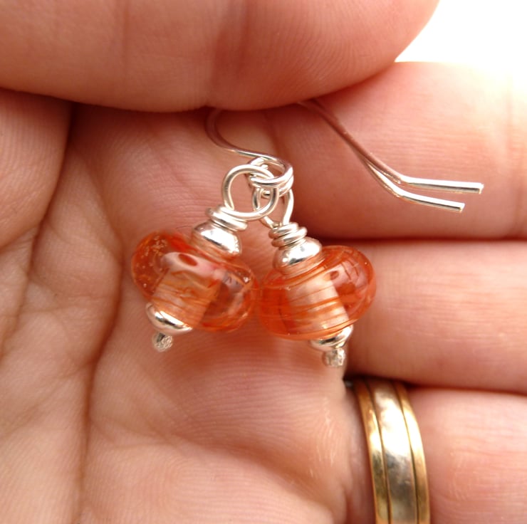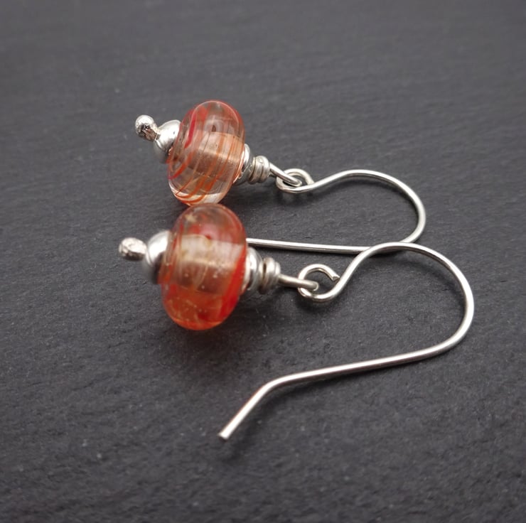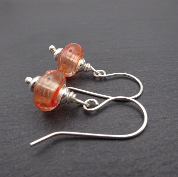 A pair of earrings made with handmade sterling silver ear wires, sterling silver beads and handmade lampwork glass beads.