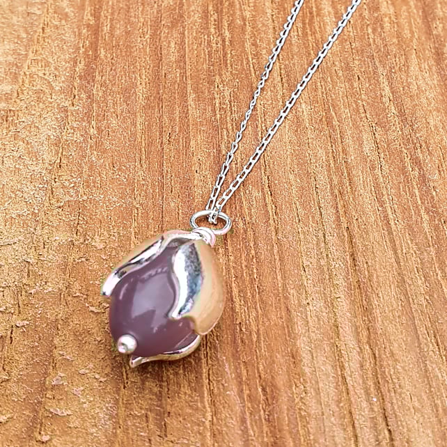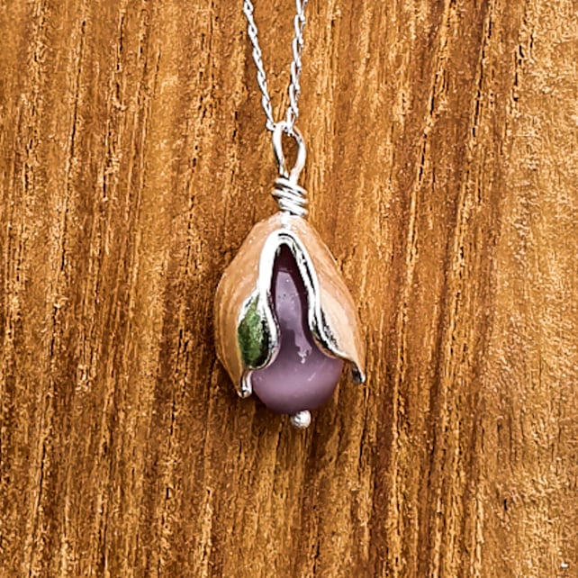 I have created the outer seed pod in fine silver using silver clay. I added a lovely pale lilac cats eye quartz stone for the seed, wire wrapped on a handmade sterling silver headpin. The pendant comes with a delicate 18 inch long diamond cut sterling silver surb chain.