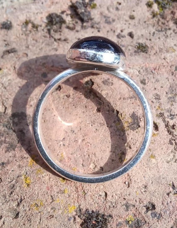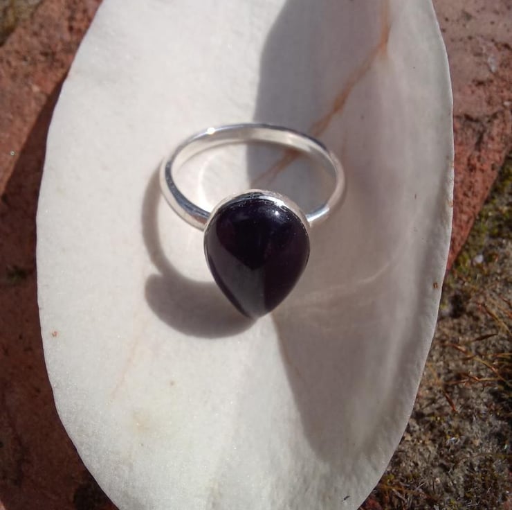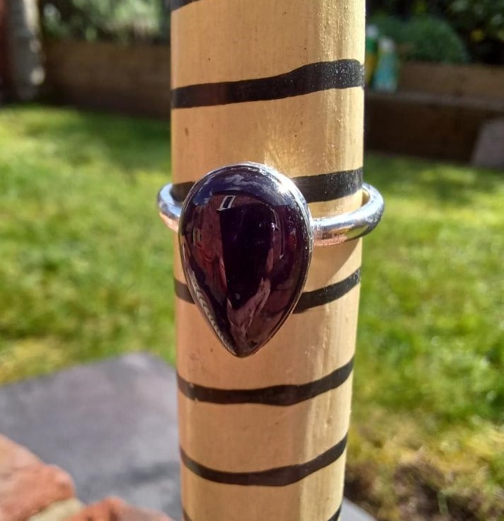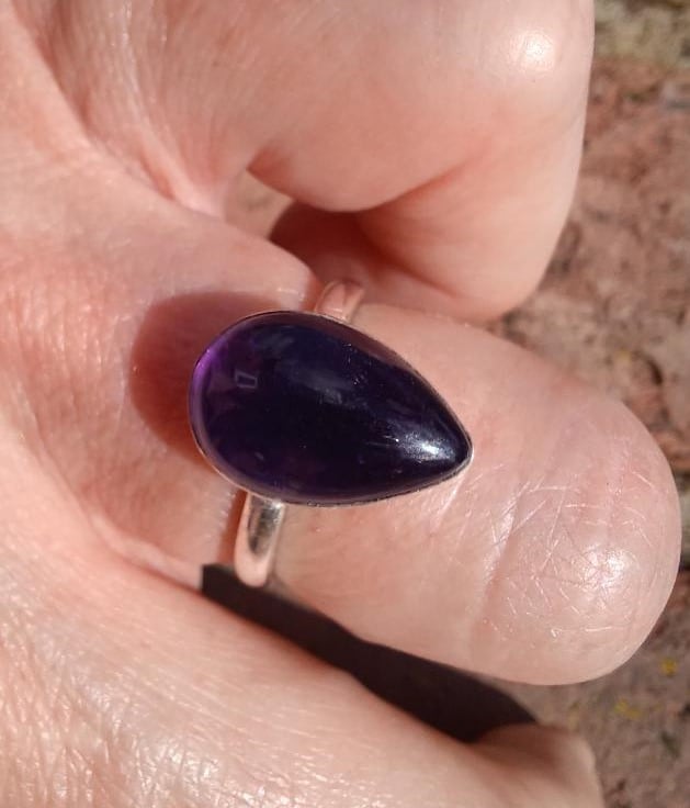 Stylish and elengant - a beautiful pear shaped purple amethyst cabochon stone set into a sterling silver ring. The stone is 10mm x 15mm. The ring is size O.