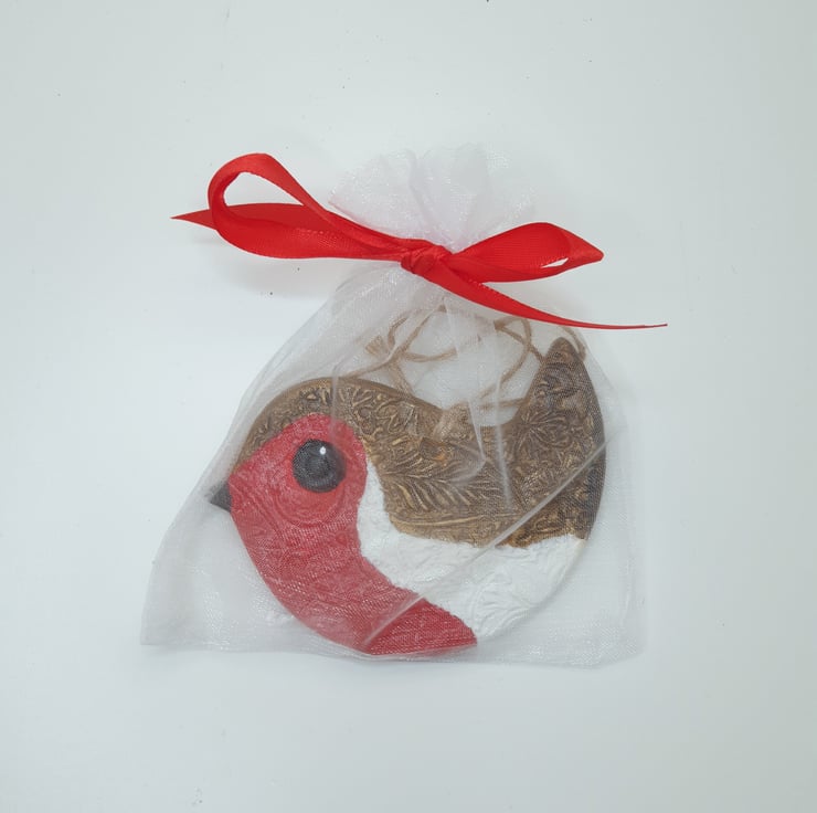 Beautiful robin redbreast Christmas tree decoration which has been lovingly made from air dry clay. Both sides of this gorgeous robin have been decoratively embossed, handpainted with acrylics and then varnished for added protection.