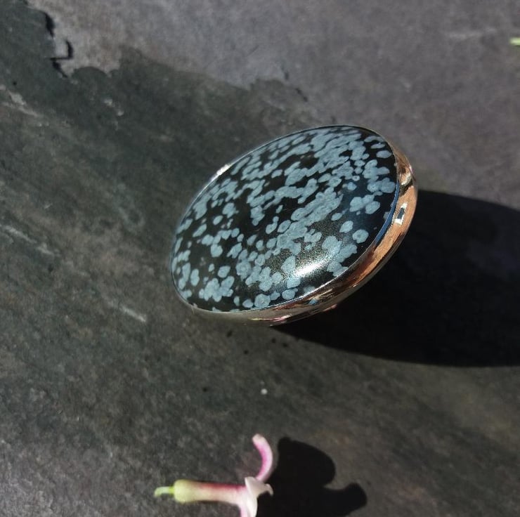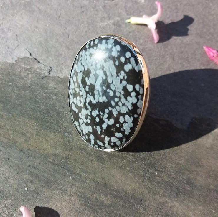 A gorgeous statement ring set with a huge black and white snowflake obsidian cabochon. The 30mm x 40 mm stone is set onto a scrolled and textured sterling silver shank.The ring is size L (US size 51/2; 16mm diameter).