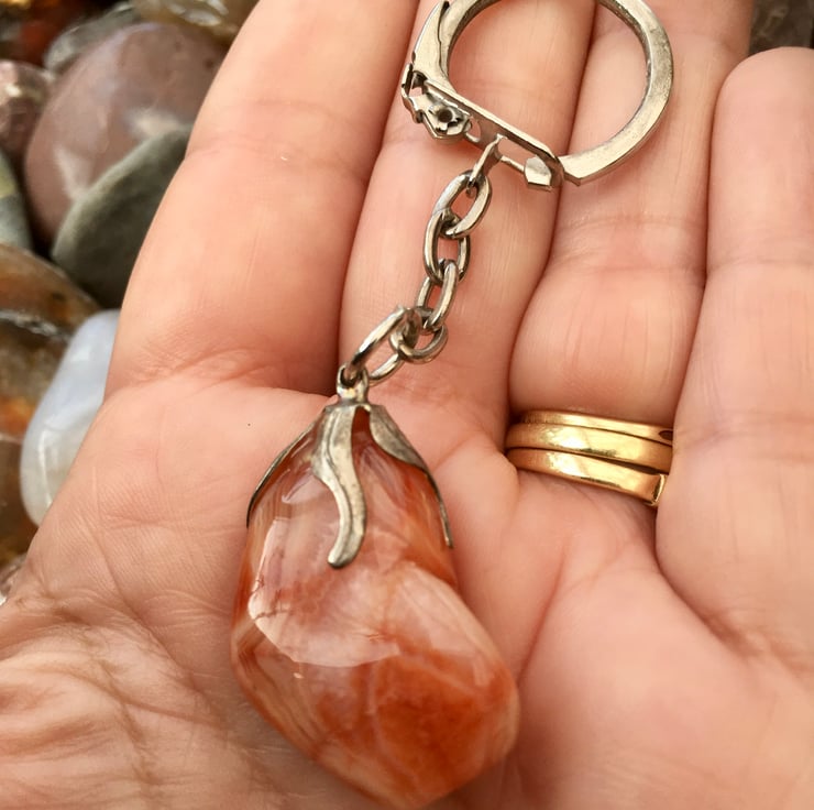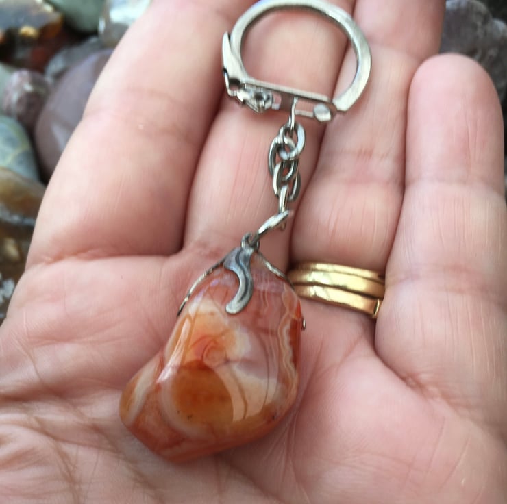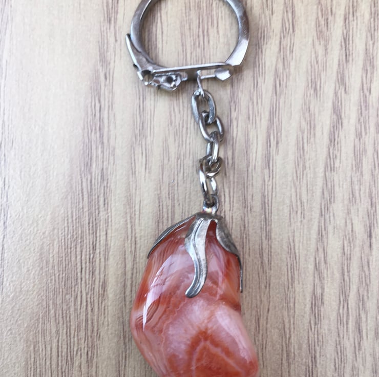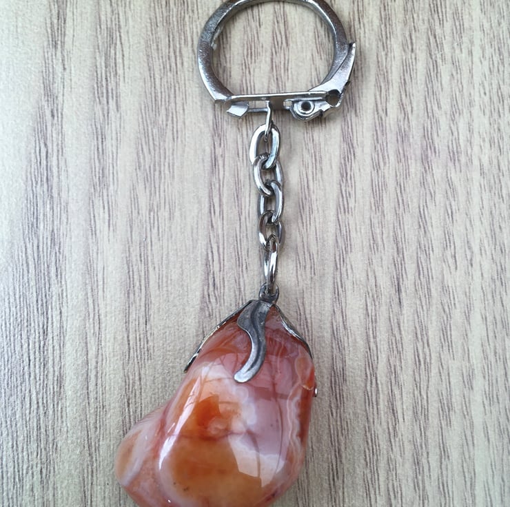 The orange banded agate is in a freeform rounded shape and alone measures approx 30mms in total length, with a width across the widest point of approx 17mms and a depth of approx 10mms, the whole keyring measures approx 78mms in length.