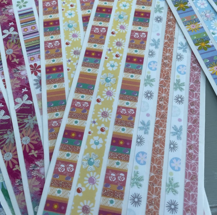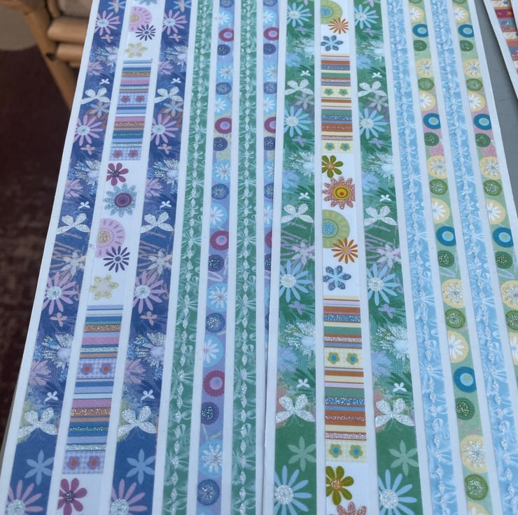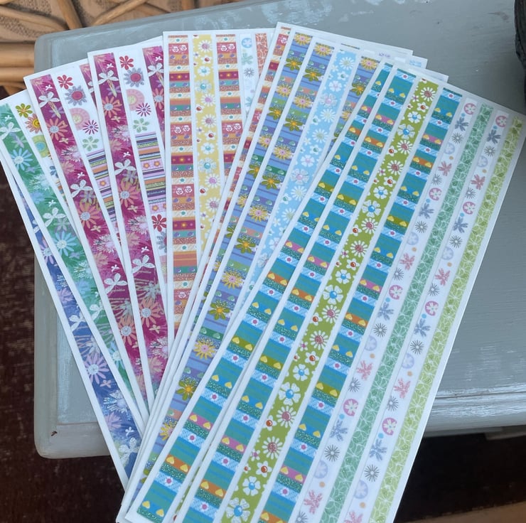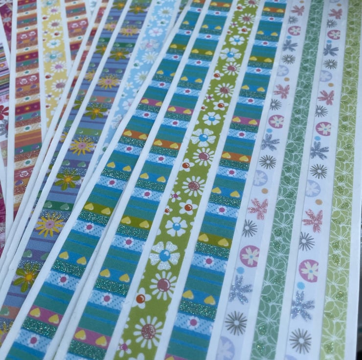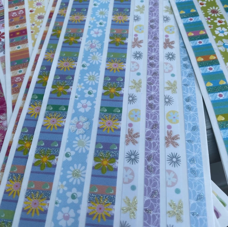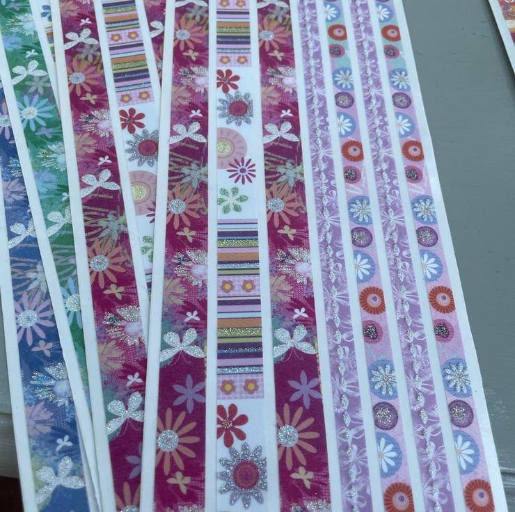 10 sheets of pretty decorative ribbon strips. Each sheet has 7 strips of satin and glitter ribbon in different designs. They feature stripes, flowers, circles, butterflies and leaves. The sheets are various colours - greens and yellow (1 sheet), purples and green (1 sheet), purples and blues (2 sheets), orange and yellow (2 sheets), red and pink (2 sheets), blue and green (2 sheets). Each ribbon strip is 30cm long.