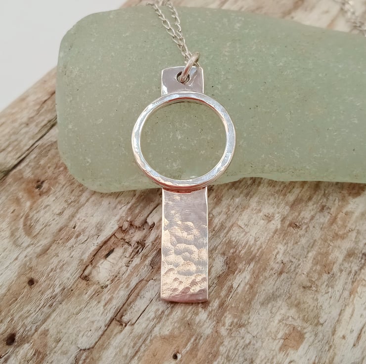 I have made this beautiful pendant by creating a sterling silver hoop measuring approximately 14 mm which I have hammered. I have then incoroprated this into sterling silver to which I have also given a hammer textured finish.