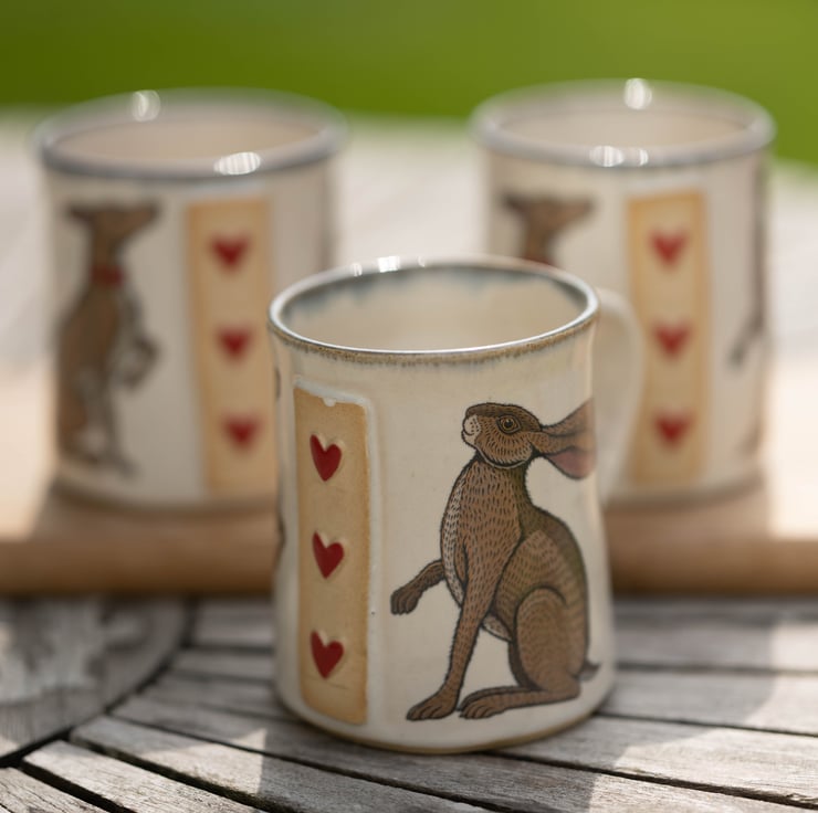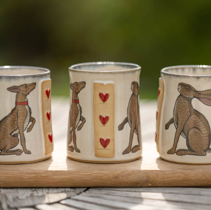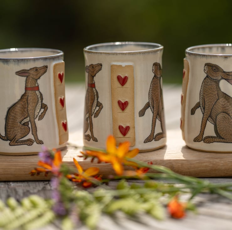 and sighthound sitting either side of a hand pressed and painted love heart motif. The images are taken from his original drawings and fired onto my pottery in a third firing to make them robust and part of the pottery piece.