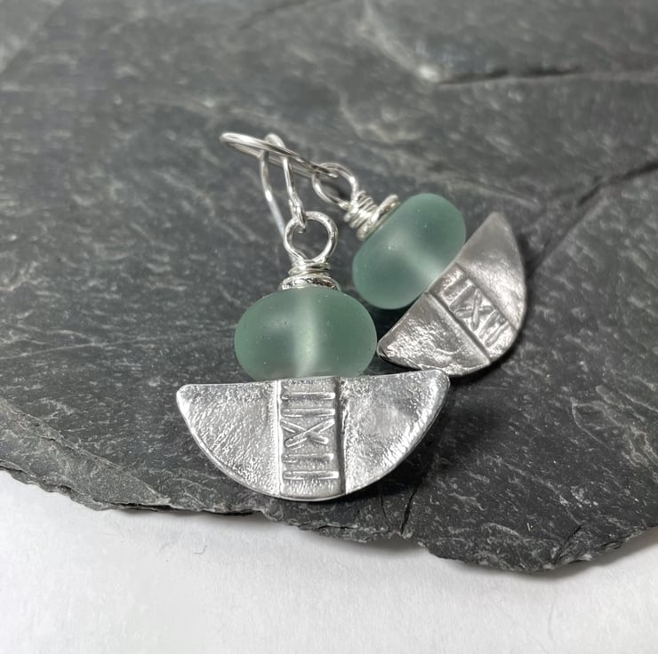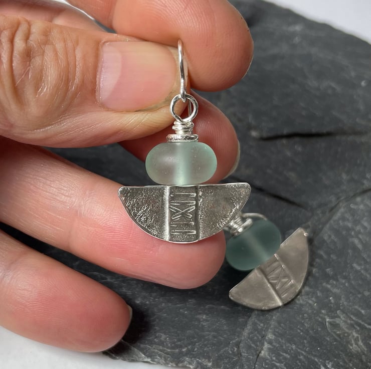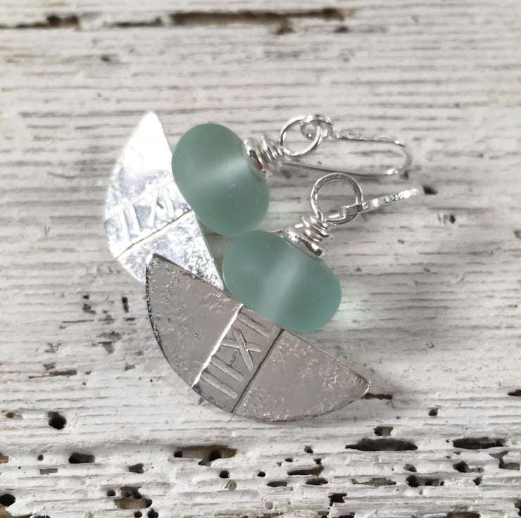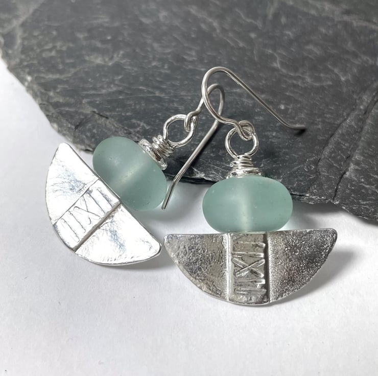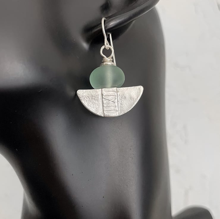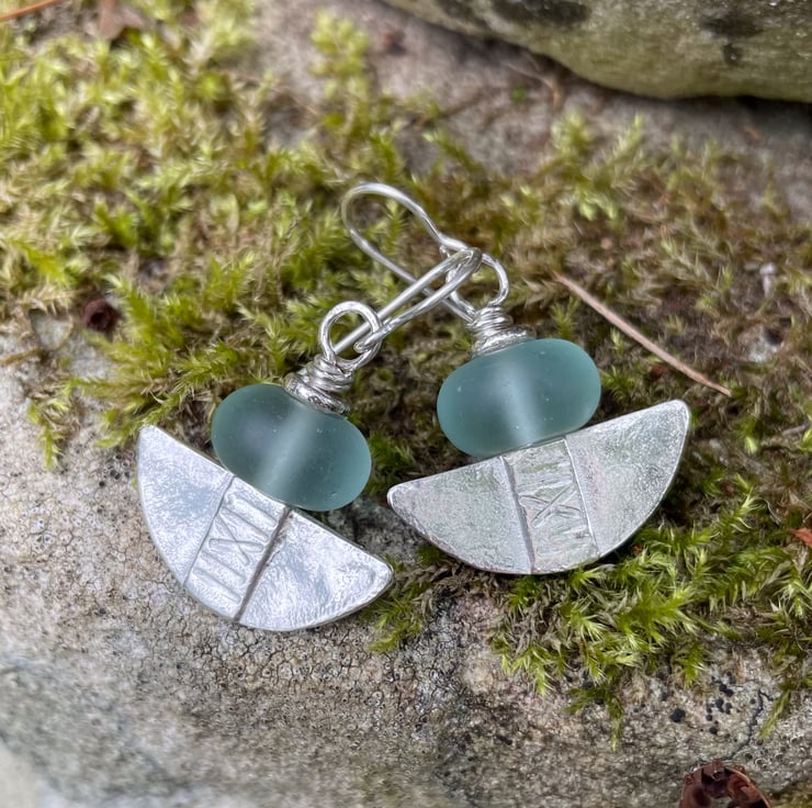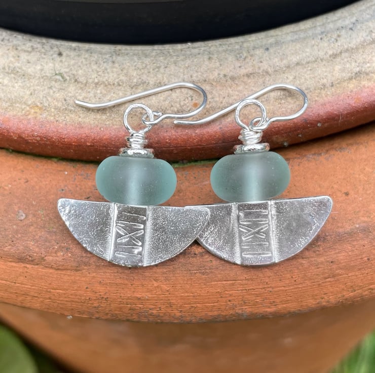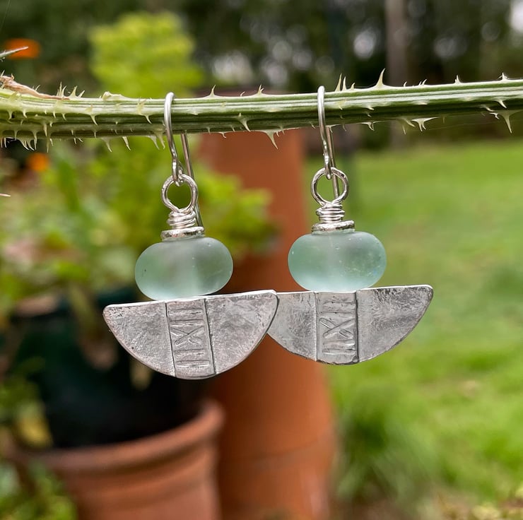 The silver blades have been fused and beaten for texture and a pattern has been punched. These are topped with a plump rondelle of “sea glass”