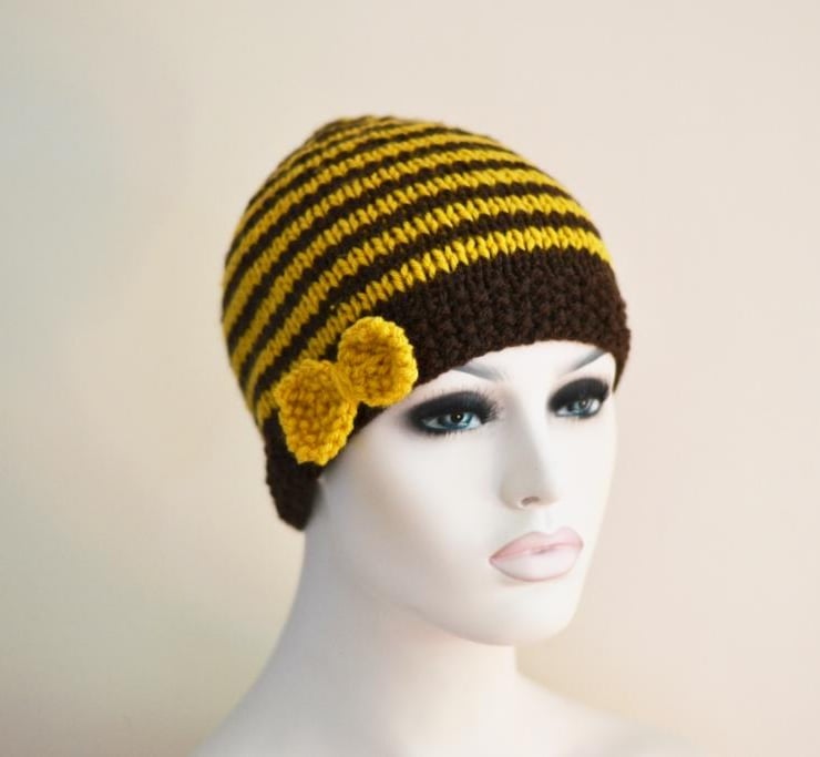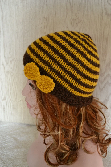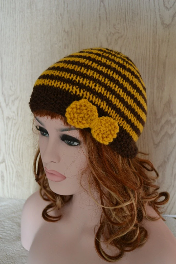 Hand knitted striped beanie in a chunky yarn using 1 strand mustard and 1 strand brown. It is finished with a hand knitted bow which is sewn to one side of the hat. My camera hasn't shown the true colour of the mustard so included a photo of the ball of wool.