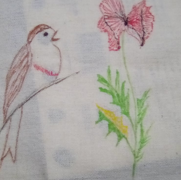This is my own design which I have hand embroidered onto a Cream Linen fabric. A mixture of stitches and threads have been used, including chain stitch, stem stitch, edging stitch.
