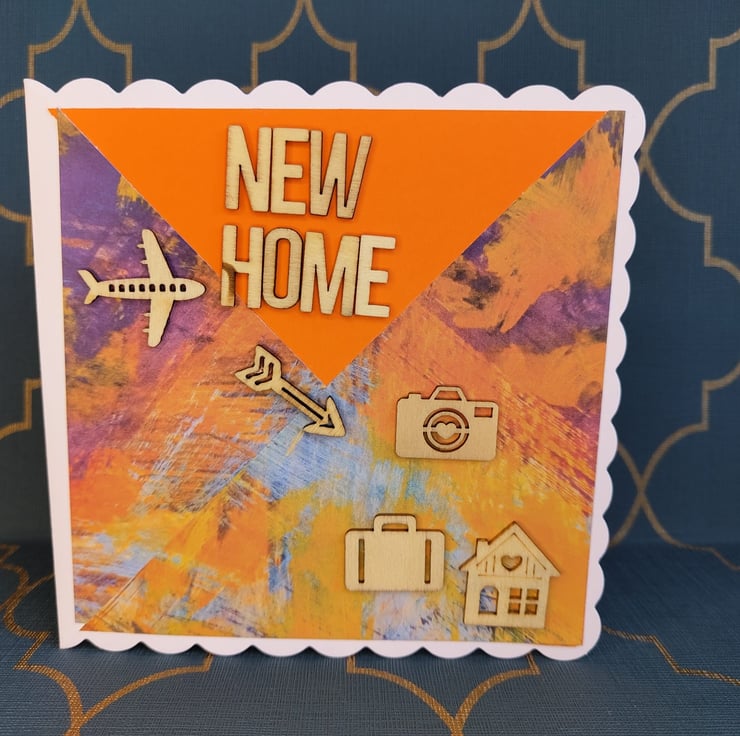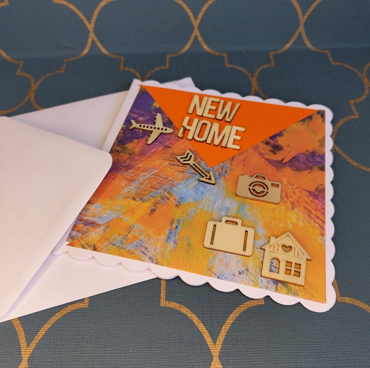 Bespoke individually handmade new home card using the best quality card with a unique design. Using individually selected wooden embellishments/vinyl/card to personalise each card. This card comes with a cream parchment inlay perfect for your own personalised message. All cards come with a unique wax stamp on the back telling you who’s designed the card.