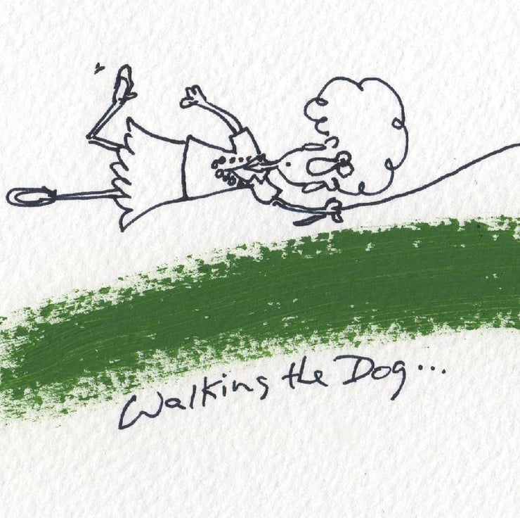 Cartoon Artwork. 'Walking the Dog, Female'. Are you walking the dog, or is the dog walking you?....