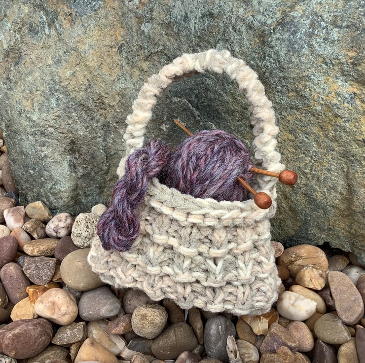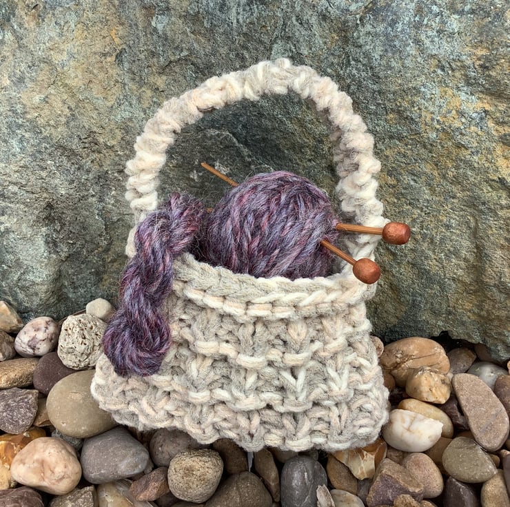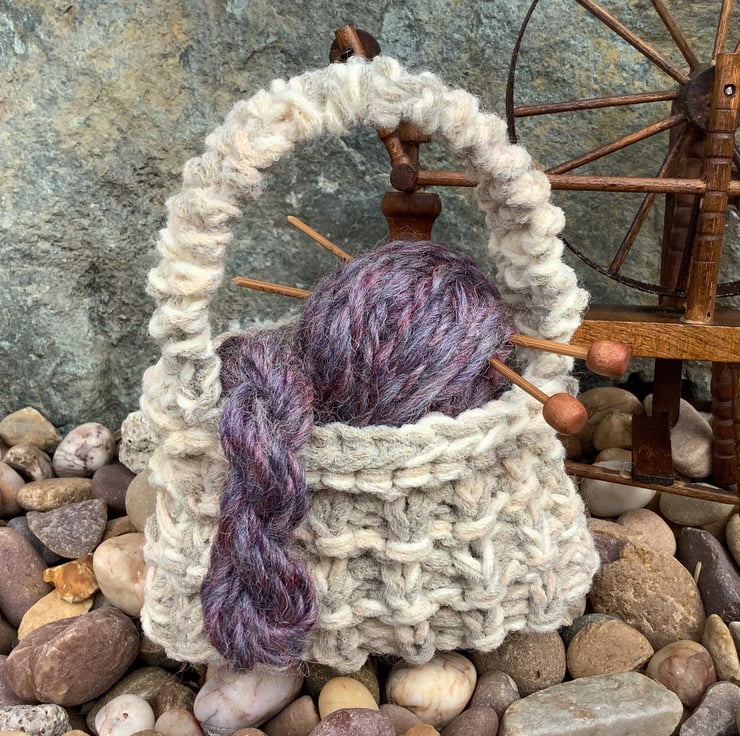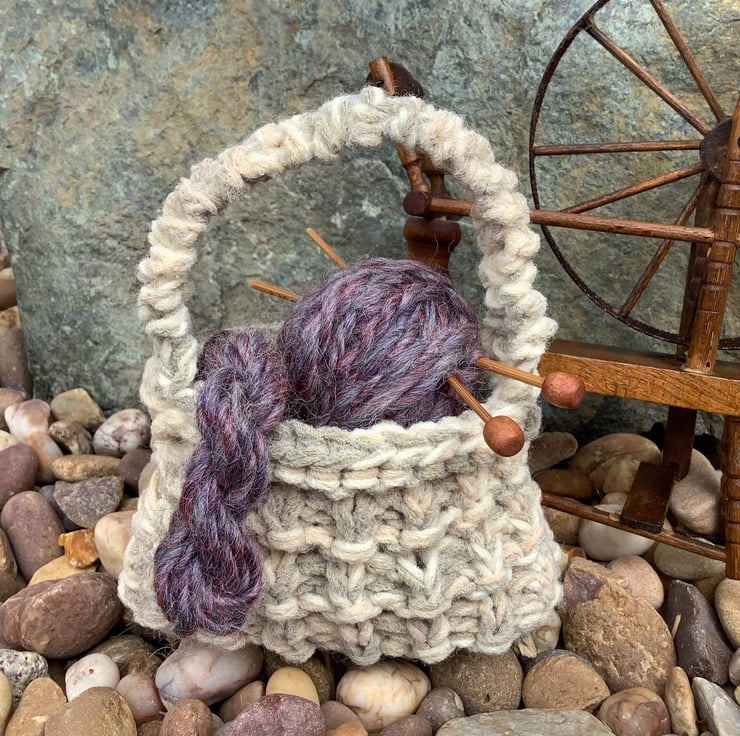 The little basket is hand crafted from manmade fibre; inside, there is a tiny handspun Bluefaced Leicester ball and skein of wool - with natural bamboo needles - laid on a bed of natural unspun fibre.
