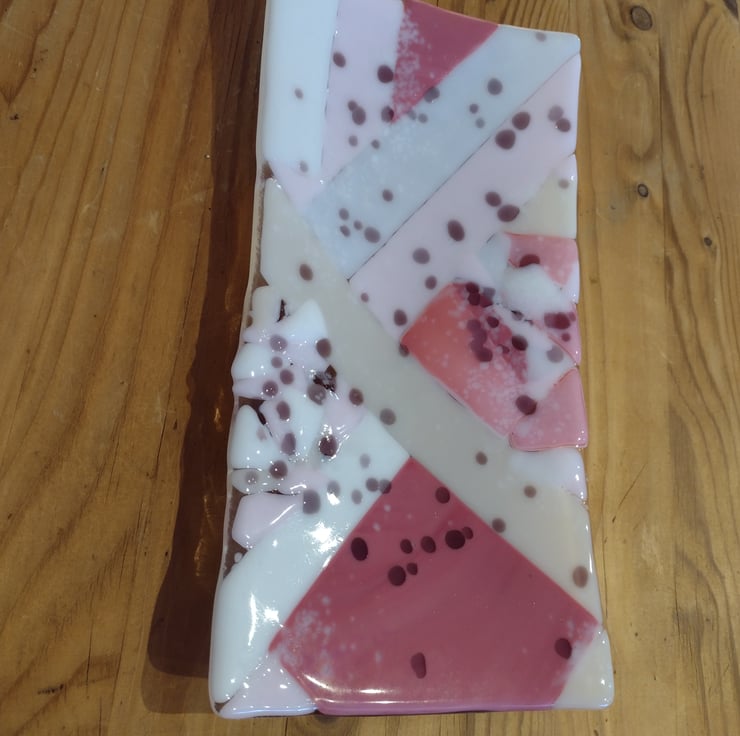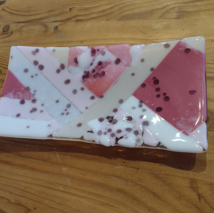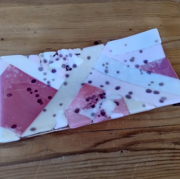 This abstract patchwork platter is created from pieces of decorative glass, fused together and slumped into a bowl.