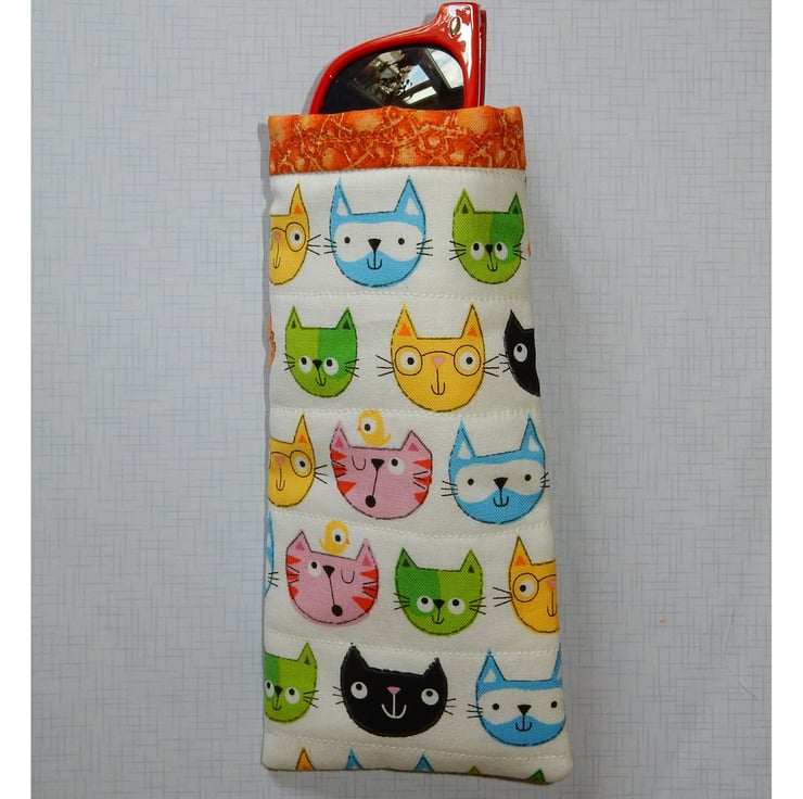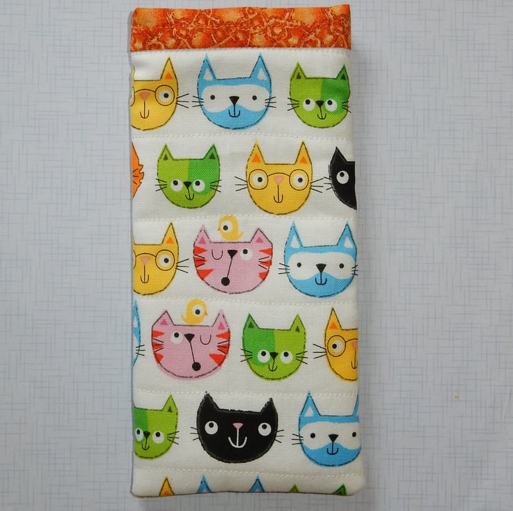A beautiful bright glasses case which features cute cat faces, in a variety of colours. It has been quilted to enhance the effect and and has a toning orange fabric for the trim, which is also used for the lining. It is made from cotton fabrics with a layer of wadding for protection. This is a slip in style glasses case, if you require a case which fastens please view my other listings.