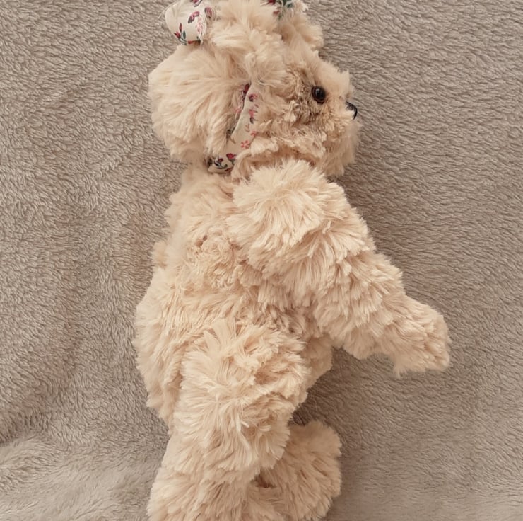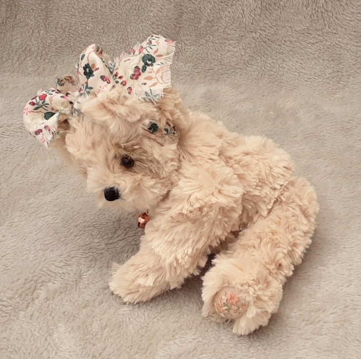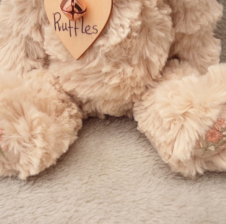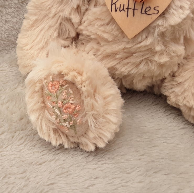 Ruffles has wool felt paw pads hand embroidered with flowers in soft peach and orange shades. She has brown safety eyes and a hand embroidered nose.