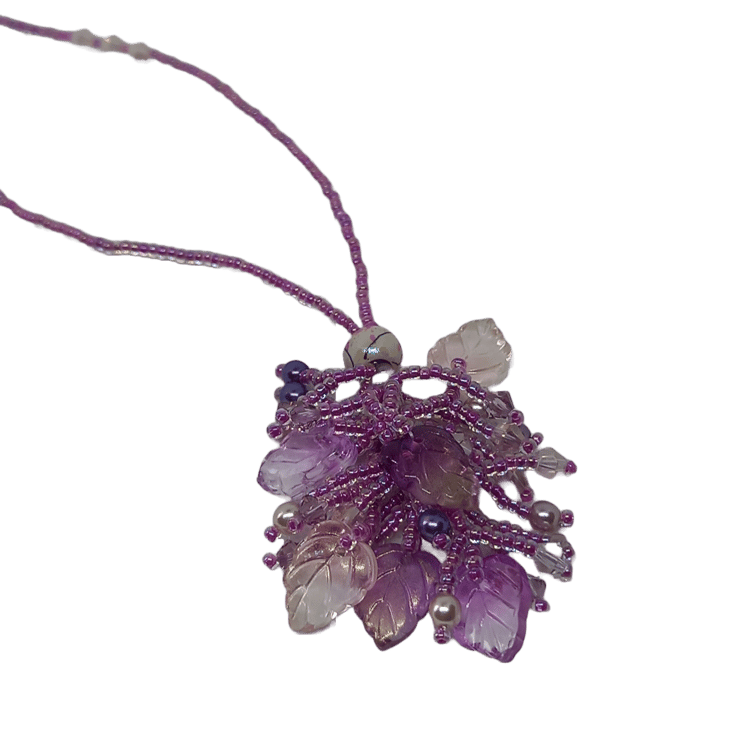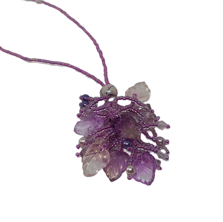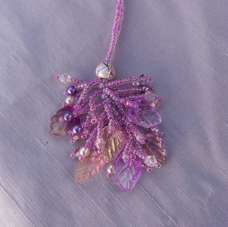 The glass leaves within this piece were the starting point of this design. There's an iridescent quality which made me think of fairies. Beaded in a tassel style this is such a pretty necklace, sure to add a touch of magic to your outfits!