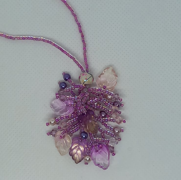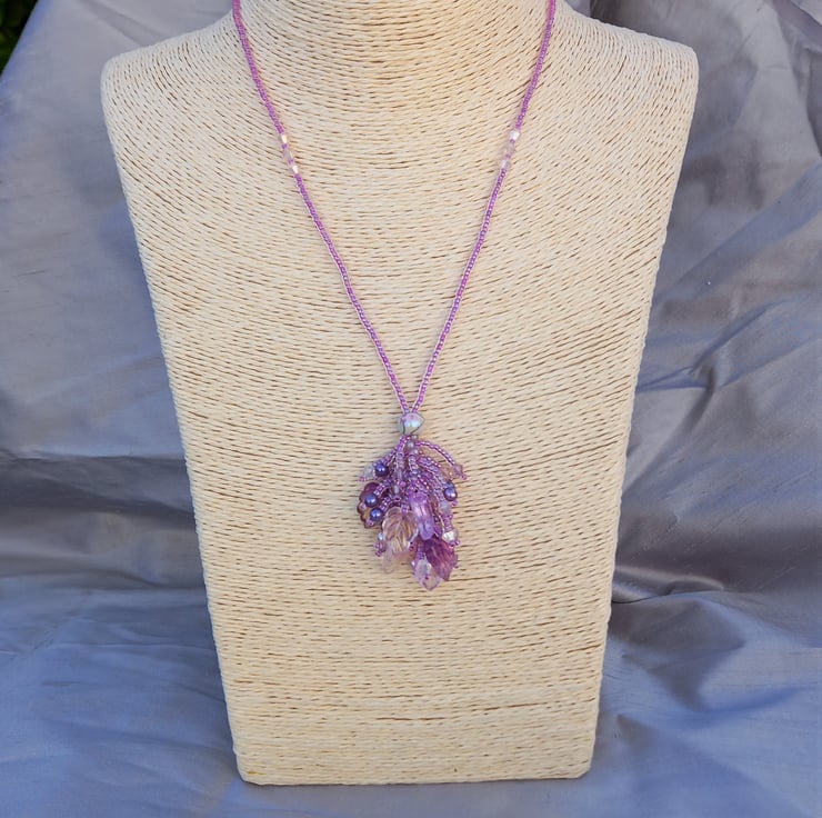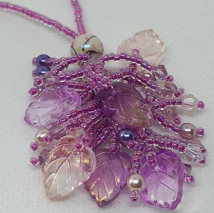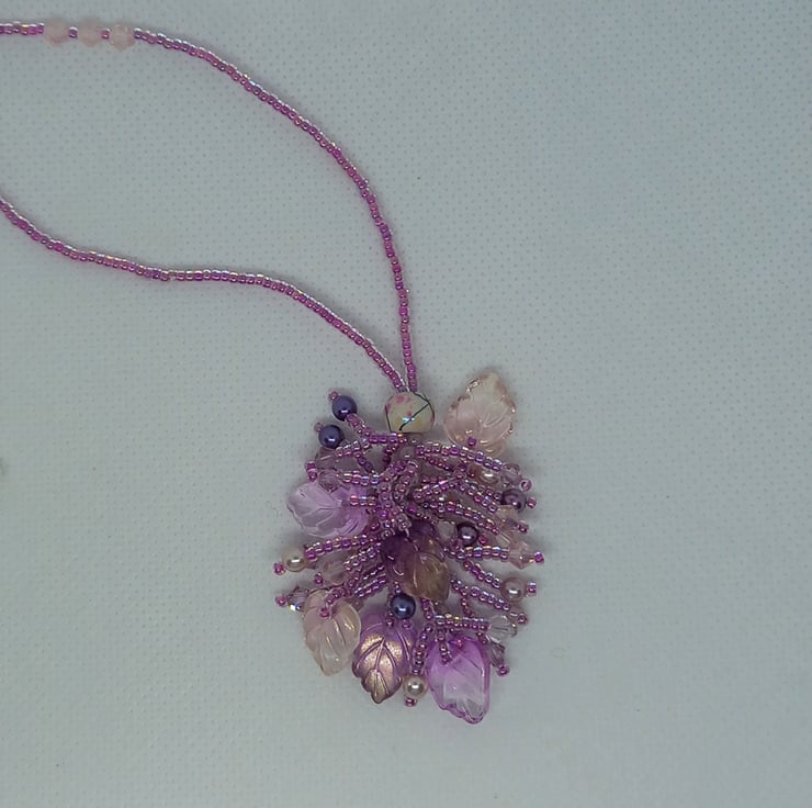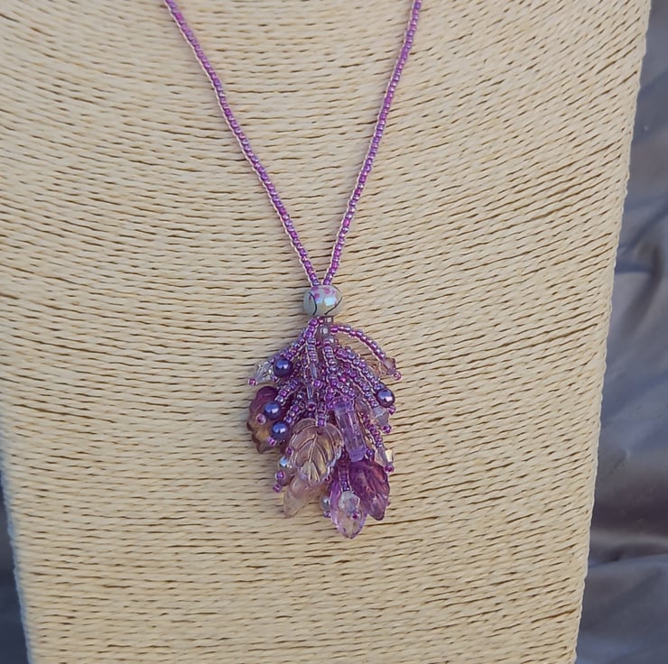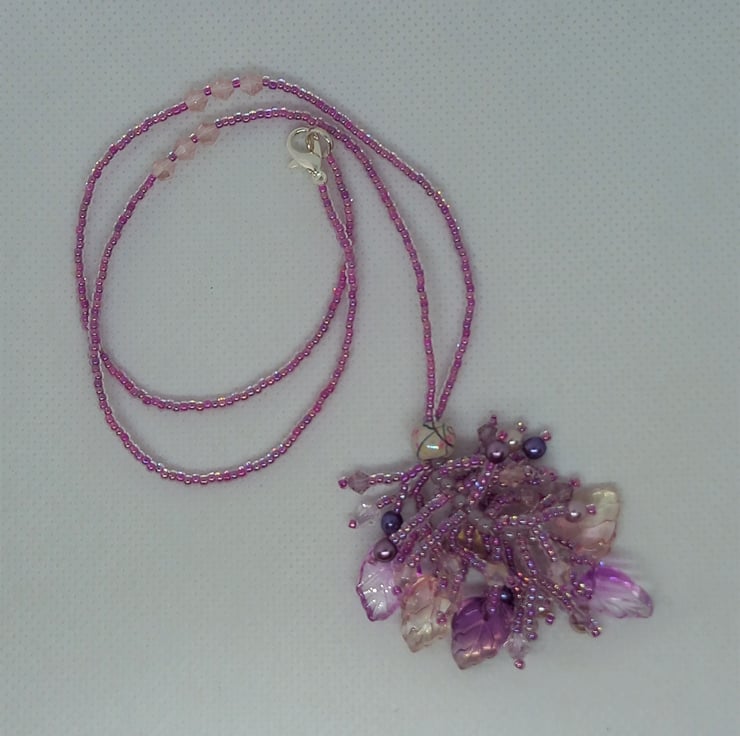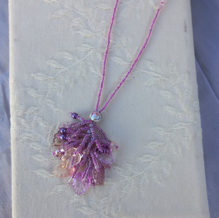 A cluster of iridescent glass leaves, glass pearls, bicones and seed beads in shades of pink and mauve make up this pretty tassel style necklace with a beaded chain. Entirely hand stitched and with a definite fairy feel to it, this easy to wear necklace fastens with a simple lobster clasp.