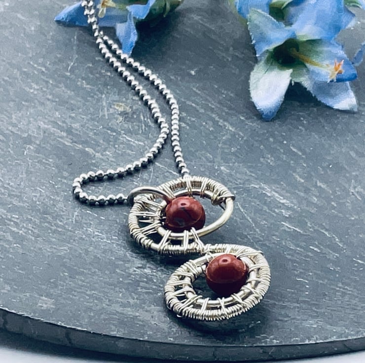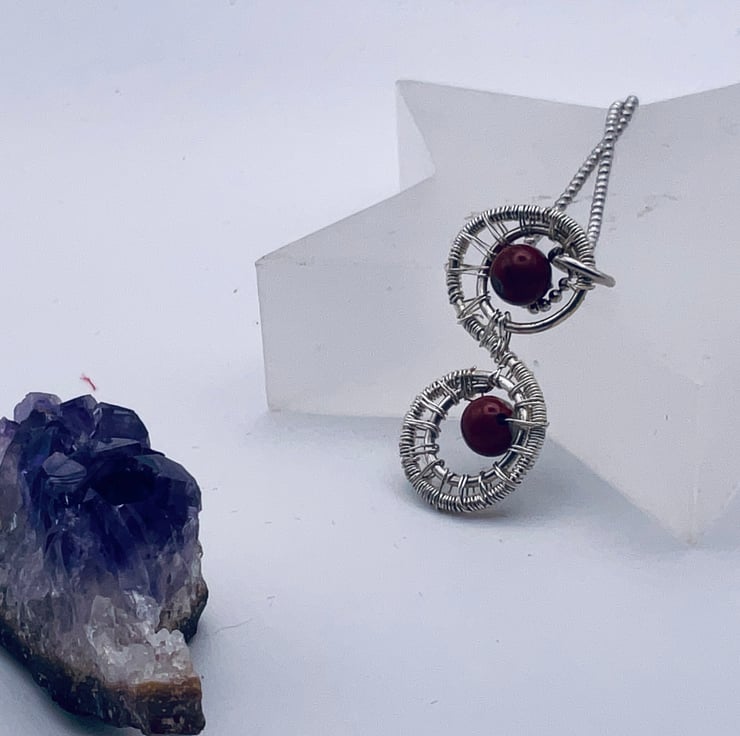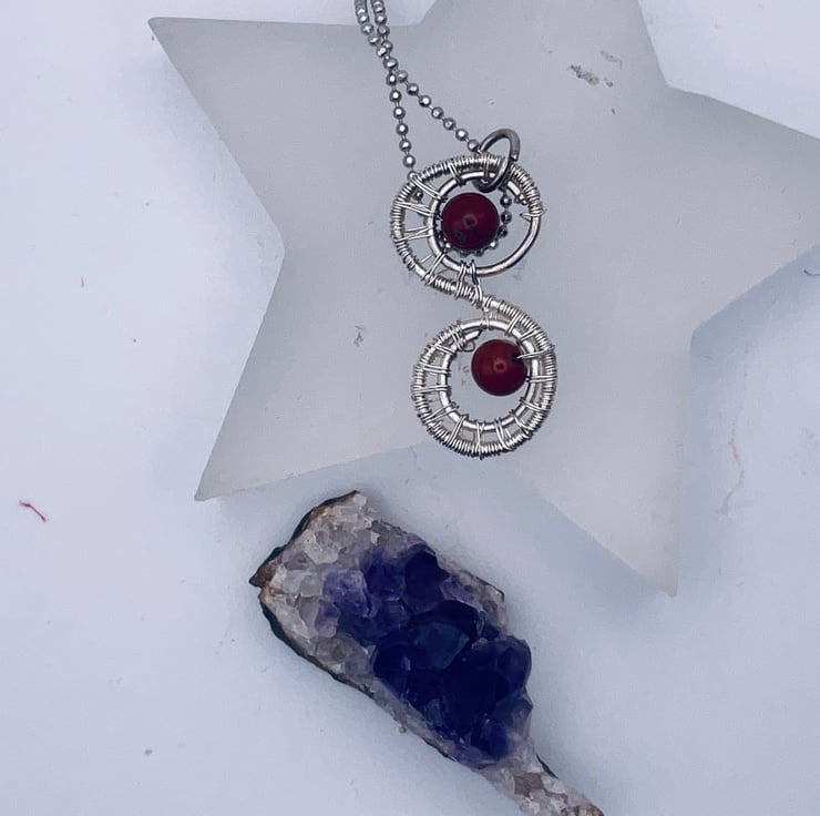 This double helix is a delight. Quite dainty in appearances yet perfect as a gift to someone who wears autumnal colours. Each circlet hods a carnelian bead at it’s centre.