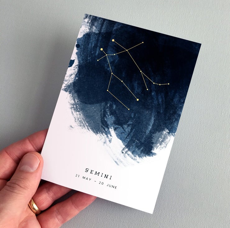 A gorgeous A6 sized eco birthday card showing an illustration of the Gemini constellation on a dark inky blue brushstroke background.