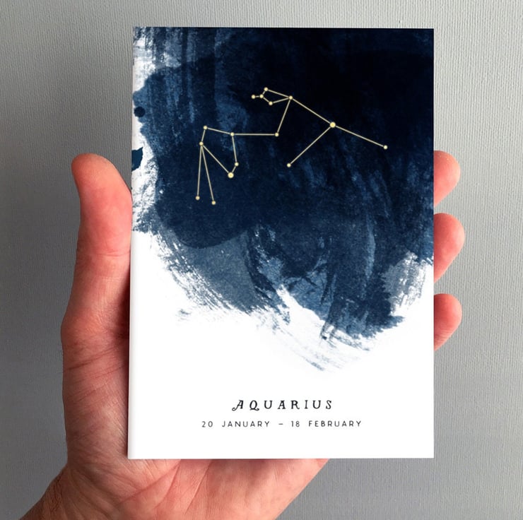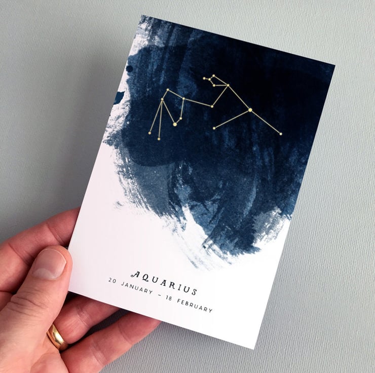 This A6 astrology eco-friendly birthday card shows an illustration of the Aquarius constellation on a dark inky blue brushstroke background.